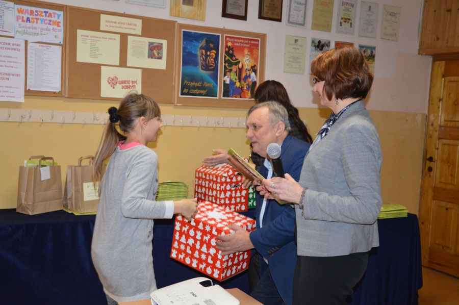 Słowa wiersza posłużyły jako myśl przewodnia uroczystości, która miała miejsce 22 grudnia – Szkolnej Wigilii. Wzięli w niej udział zaproszeni goście, przedstawiciele rady rodziców, grono pedagogiczne, pracownicy obsługi,  oraz uczniowie obydwu szkół.  Swą obecnością zaszczycili nas Ojcowie Franciszkanie – Ojciec Łukasz Gora  i Ojciec Marcin Buntov, Ks. Prefekt Marcin Żuchowicz, Henryka Oleksy – Prezes Parafialnego Koła CARITAS w Iwanowicach, Jolanta Zębala – Radna Gminy Iwanowice; Sołtys Wsi Poskwitów Nowy, Dr. Teresa Walczak – Czuba, Małgorzata Mitka – Prezes KGW w Poskwitowie, Ewa Patoła – Sołtys Wsi Przestańsko,  Janusz Adamczyk – Vice Przewodniczący Rady Rodziców,  Emerytowani nauczyciele, Przyjaciele z Centrum Wsparcia Dziecka i Rodziny w Pszczynie, Przyjaciele i darczyńcy naszych szkół. W programie uroczystości obejrzeliśmy bardzo ciekawe Jasełka w wykonaniu uczniów szkoły podstawowej i gimnazjum. Jasełka przygotowała pani Renata Jagiełka przy współpracy pani Urszuli Kubik. Uczniowie złożyli wszystkim świąteczne życzenia  i wręczyli upominki. Pan Dyrektor Prowadzący Michał Znamirowski również życzył wszystkim spokojnych świąt i wszelkiego dobra. Został rozstrzygnięty konkurs na rodzinną szopkę bożonarodzeniową, w którym nagrody ufundowała Rada Rodziców, za co serdecznie dziękujemy. Wystawę pięknych i bardzo oryginalnych szopek można było  obejrzeć w budynku szkoły. Zaśpiewaliśmy także wspólnie kolędy pod przewodnictwem Ojca Marcina i Łukasza. Po modlitwie i błogosławieństwie przeszliśmy do budynku szkoły, gdzie łamaliśmy się opłatkiem i składaliśmy sobie świąteczne życzenia. Na zakończenie goście, nauczyciele i uczniowie zastali poczęstowani przygotowaną przez klasę III g pod kierunkiem pani Joanny Obrzud wigilijną rybą, barszczem i ciastem. Dzięki zaangażowaniu całej społeczności szkolnej uroczystość  przebiegła w miłej, rodzinnej  atmosferze. Szczególne słowa podziękowania kierujemy do pana Marka Piekary za podarowaną rybę, Państwu Kralkom zaś dziękujemy za piękną choinkę.