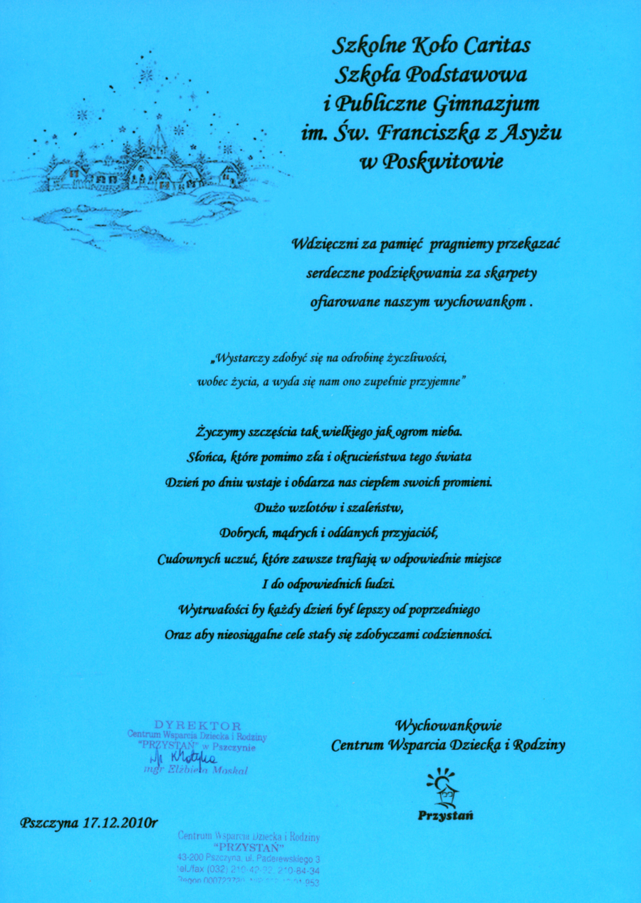 Już po raz trzeci z okazji Św. Mikołaja i Świąt Bożego Narodzenia nasze Szkolne Koło Caritas zorganizowało zbiórkę skarpet dla dzieci z Domu Dziecka w Pszczynie. W akcję tę włączyli się uczniowie i nauczyciele naszych szkół. Dzięki ich dobremu sercu mogliśmy obdarować naszych przyjaciół z Pszczyny ponad 100 parami skarpet. Nasz dar sprawił im wiele ciepła i radości. To już kolejna taka akcja w naszej szkole promująca działalność charytatywną, na pewno nie ostatnia.