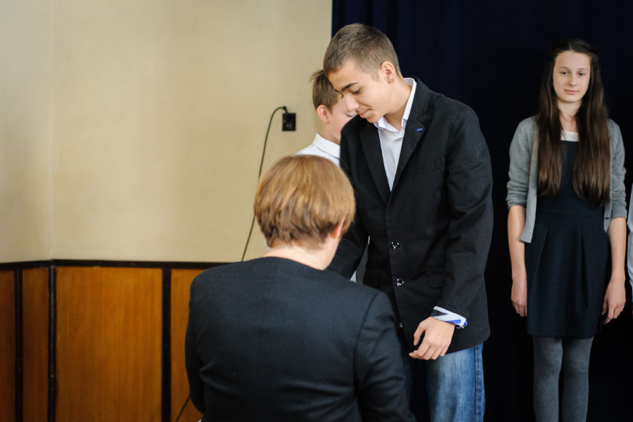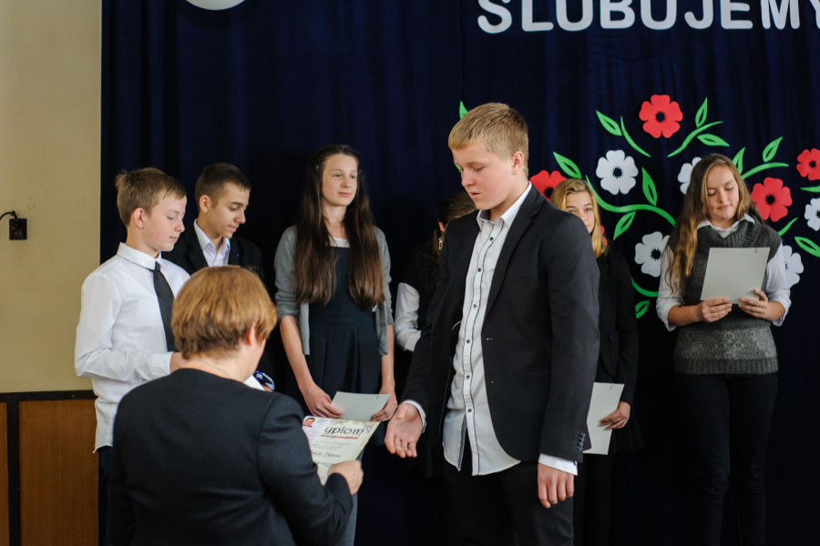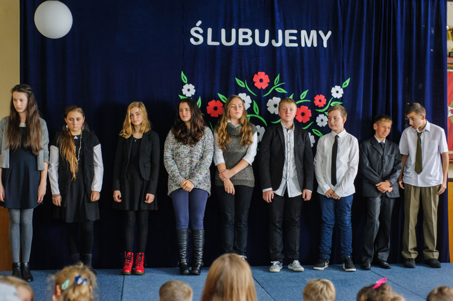 Dnia 12.10.2015, odświętnie ubrani i w podniosłych nastrojach, przyjęliśmy w nasze szeregi uczniowskie klasy I Szkoły Podstawowej i Publicznego Gimnazjum. Podekscytowane pierwszaki złożyły przyrzeczenie w obecności Dyrekcji, nauczycieli, Rady Rodziców oraz uczniów. Tą podniosłą uroczystość uświetniły występy artystyczne naszych kolegów i koleżanek, jak również przemówienie Pana Dyrektora Prowadzącego, Michała Znamirowskiego.