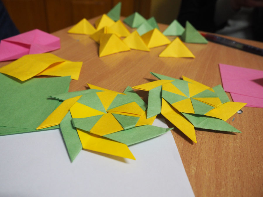W warsztatach uczestniczyły 23 rodziny - w przybliżeniu 80 osób. Na początku, rodziny zapoznały się, w krótkim wykładzie, z historią i technikami składania origami oraz ciekawymi stronami poświęconymi tej sztuce. W formie dialogu poszukiwali własności matematycznych w składaniu kwadratowej kartki wzdłuż linii prostych we wszystkich kierunkach. Następnie przystąpili do wspólnej zabawy w tworzeniu modeli figur płaskich i przestrzennych, której towarzyszyła rodzinna atmosfera i dobry humor.