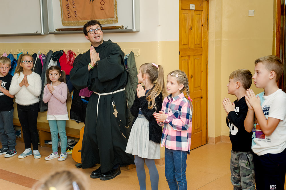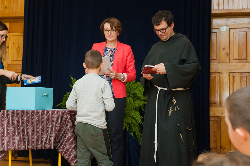 Rozdanie nagród nastąpiło w czasie spotkania z ojcem franciszkaninem, podczas którego wspólnie śpiewaliśmy piosenki religijne tematycznie związane z patronem naszej szkoły. Laureaci konkursu otrzymali nagrody w postaci pomocy plastycznych: pisaki, a także książeczki o Świętym Franciszku i breloczki. Pozostałe dzieci za udział otrzymały książeczki. Nagrody zostały ufundowane przez Radę Rodziców Szkoły Podstawowej im. św. Franciszka z Asyżu w Poskwitowie.