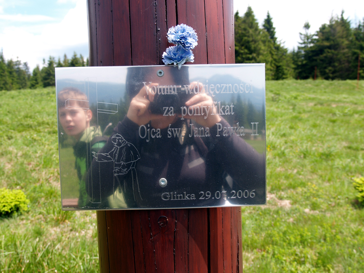 w której często nocował przyszły Papież u zaprzyjaźnionych gospodarzy. Na Krawcowym Wierchu znajduje się bacówka, krzyż papieski i ostania stacja drogi krzyżowej z Janem Pawłem II, której początek jest przy kościele w Glince. Po ognisku i posiłku zeszliśmy bardzo widokową trasą przez Długą Groń do Glinki, gdzie czekał na nas autokar. Po drodze zatrzymywaliśmy się przy stacjach drogi krzyżowej jedni by przeczytać umieszczone na głazach myśli Jana Pawła II inni, by zobaczyć ile jeszcze zostało stacji do przejścia.