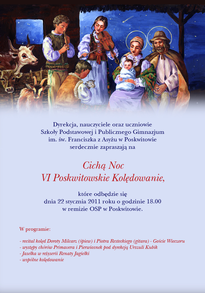 Już po raz czwarty w drugi dzień Świąt Bożego Narodzenia uczniowie ze szkoły w Poskwitowie brali udział w „Żywej Szopce” organizowanej przez Braci Franciszkanów w Krakowie. Najpierw zaprezentowali przygotowane Jasełka a później Chór Primavera kolędował wspólnie ze zgromadzonymi ludźmi wokół Żywej Szopki. Dla naszych uczniów występ ten jest niewątpliwie wielkim przeżyciem i wyróżnieniem. Prace nad przygotowaniem Jasełek i koncertu kolęd trwały długo, ale też i odpowiedzialność ciążąca na małych i młodych artystach występujących przed krakowską publicznością była ogromna.