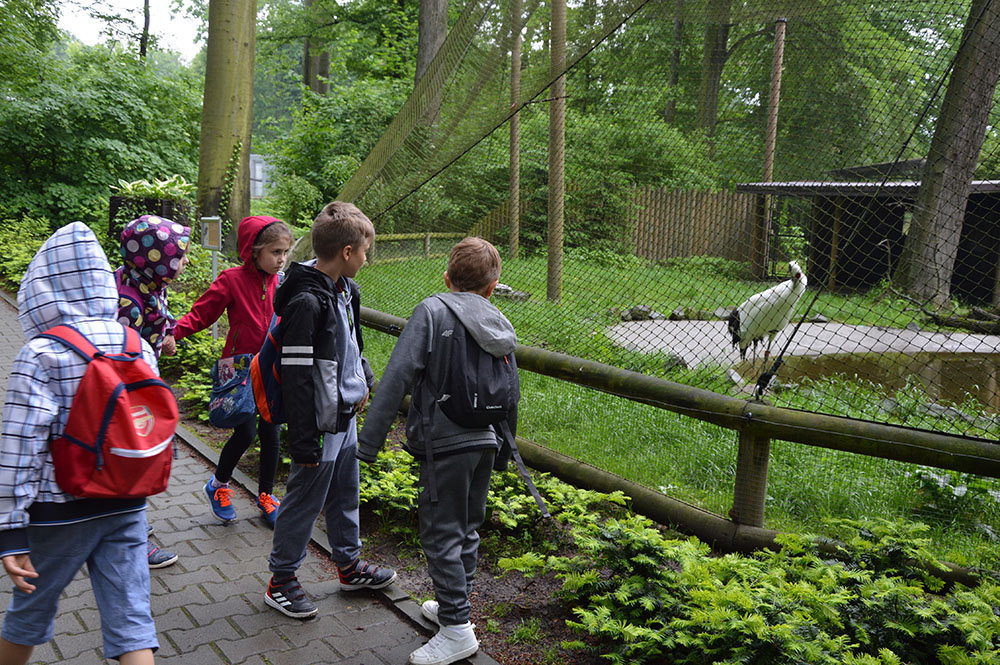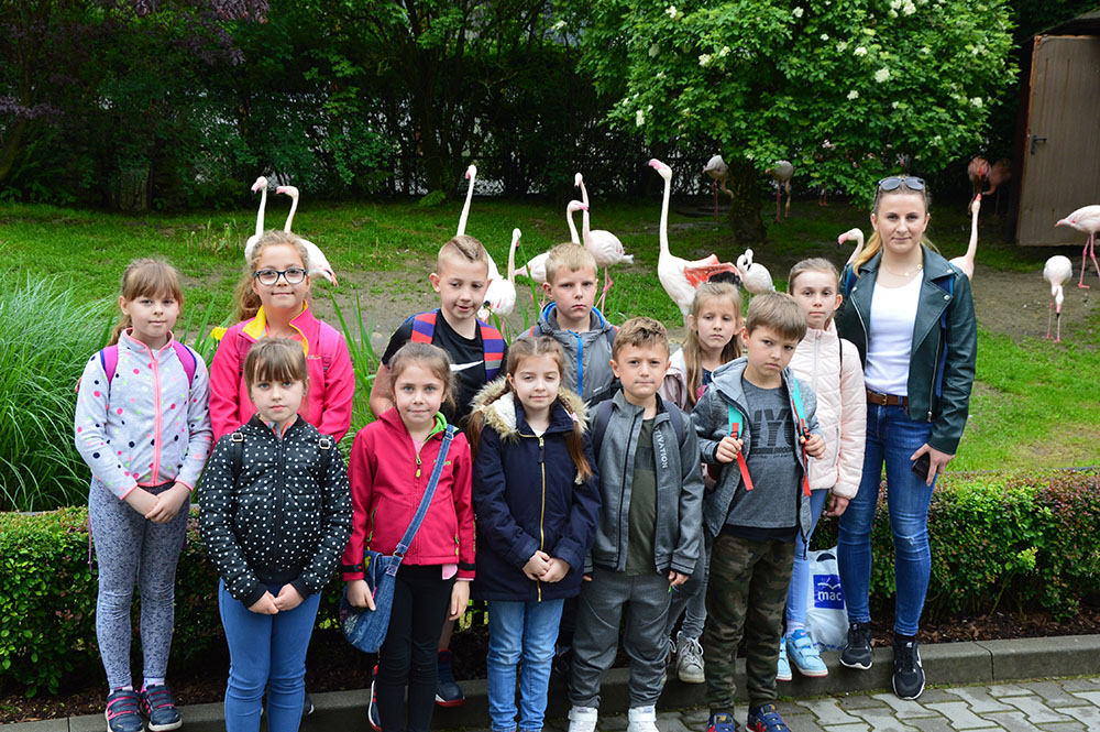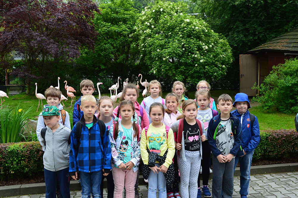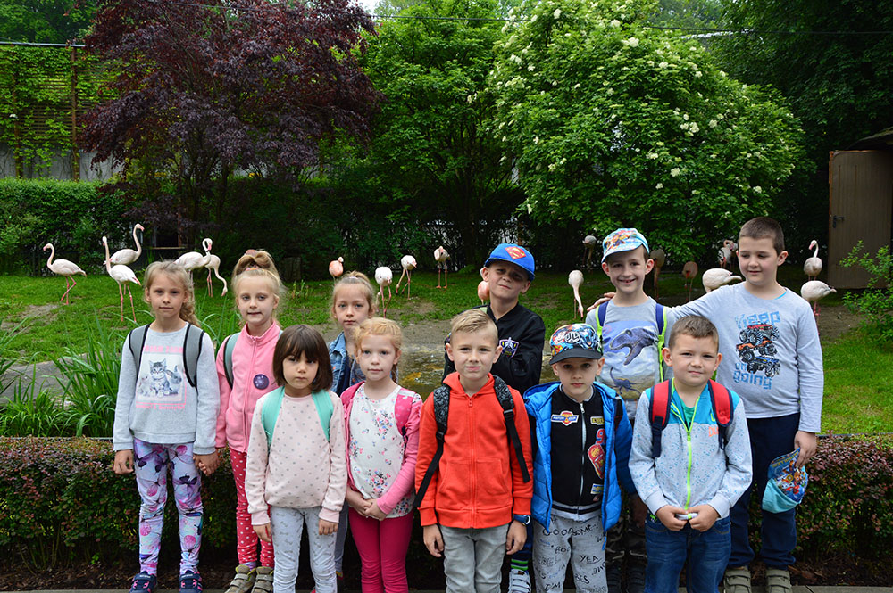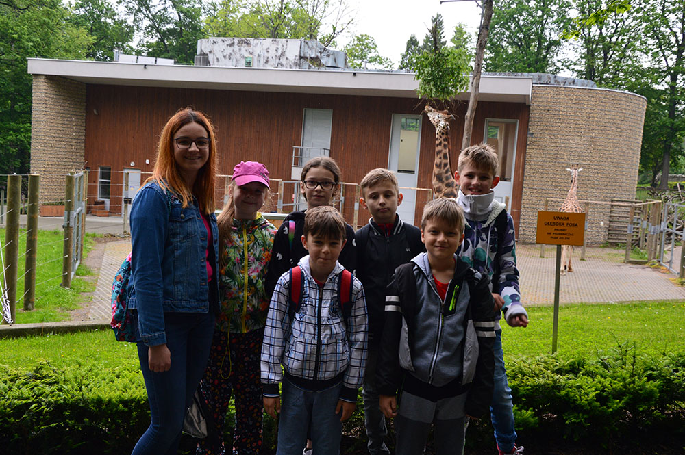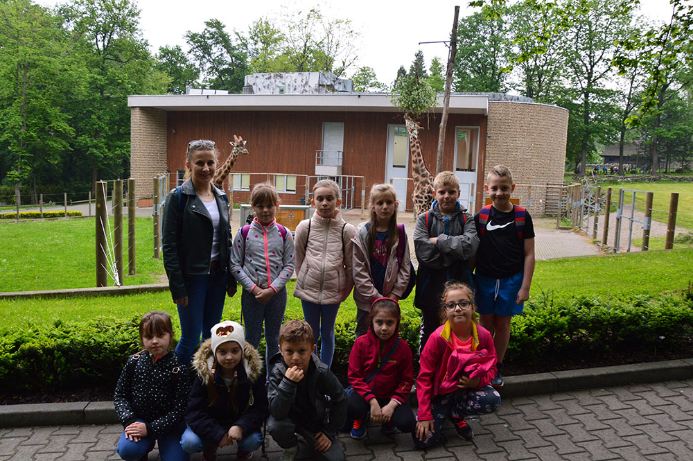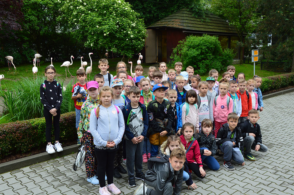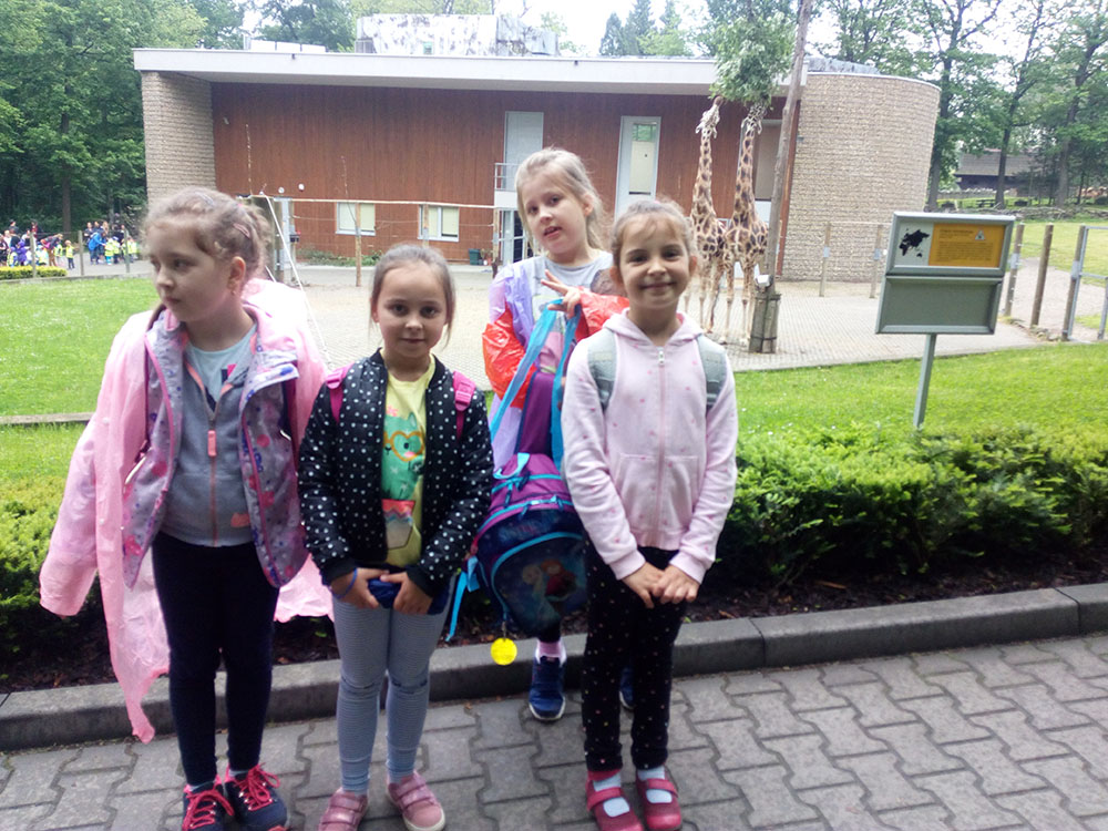 28 maja 2019 r. wspólnie z zerówką, klasą I i II pojechaliśmy na wycieczkę do ZOO. Oglądaliśmy różne zwierzęta, a niektóre z nich można było nawet pogłaskać i nakarmić marchewką np. alpaki. Podczas oglądania żyraf zaczął padać deszcz, więc schroniliśmy się pod daszkiem, gdzie można było kupić lody. Widzieliśmy malutkiego tygrysa – wyglądał słodko i wszyscy się nim zachwycali. Najbardziej podobały nam się: świnki morskie, rysie, mały tygrys, flamingi i foki.