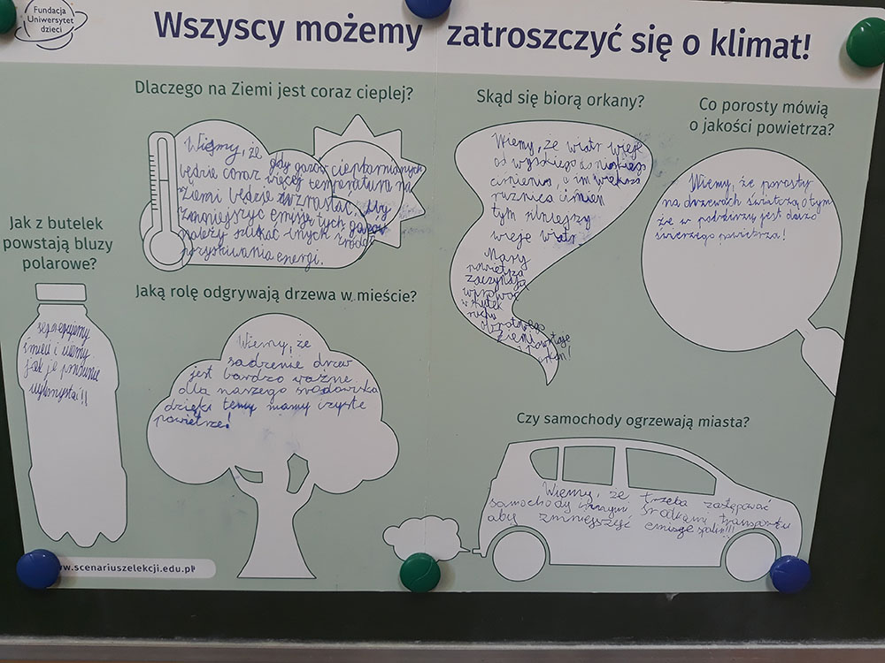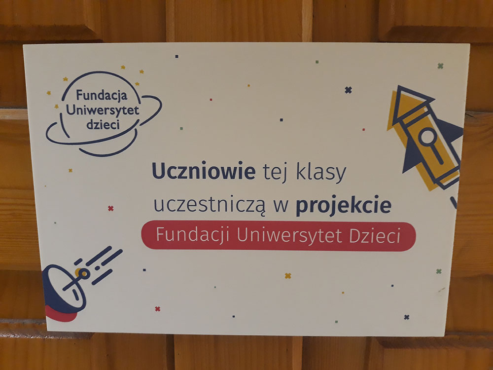 W roku szkolnym 2018/2019 klasa III wzięła udział w projekcie Klimatyczna Klasa, stworzonym przez Fundację Uniwersytet Dzieci. W czasie zajęć rozwijających uczniowie uczestniczyli w lekcjach, których tematyka poświęcona była temu jak dbać, pielęgnować i troszczyć się o nasze środowisko, a także jakie zagrożenia czyhają na otaczający nas świat. Podczas zajęć uczniowie zdobywali wiedzę poprzez oglądanie filmów, działania praktyczne, liczne doświadczenia, prezentacje multimedialne i zadania przygotowane specjalnie do danego tematu. Po każdym zadaniu uczniowie dostawali naklejki do indeksów, które zostały nadesłane wraz z zestawem edukacyjno – badawczym. Swoją przygodę z projektem uczniowie rozpoczęli zajęciami pt. „Jak rozpoznawać emocje?”, bo przecież nie tylko o klimat trzeba dbać, ale również o relacje między sobą i emocje jakie towarzyszą tym relacjom. Następnie kolejno realizowaliśmy takie tematy jak: „Dlaczego na Ziemi jest coraz cieplej?”, „Skąd się biorą orkany?” „Co porosty mówią o jakości powietrza?”, „Czy samochody ogrzewają miasta?”, „Jaką rolę odgrywają drzewa w mieście?”, „Jak z butelek powstają bluzy polarowe?”. Na zakończenie projektu zaprosiliśmy na lekcję pokazową Panią Joannę Obrzud, która jak wiadomo uczy przyrody. Uczniowie mieli okazje przedstawić to co zrobili podczas zajęć i czego się dowiedzieli. Biorąc udział w projekcie oprócz zrealizowanych celów edukacji wczesnoszkolnej uczniowie trenowali kompetencje społeczne, uczyli się myślenia naukowego, autoprezentacji, a także prowadzenia doświadczeń. Pojmowali wiedzę z zakresu ochrony klimatu i recyklingu, a najważniejsze przekonali się, że nauka może być ciekawa!