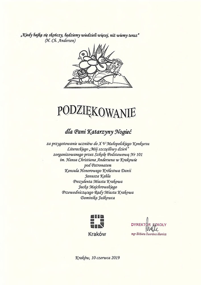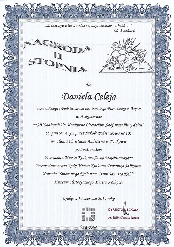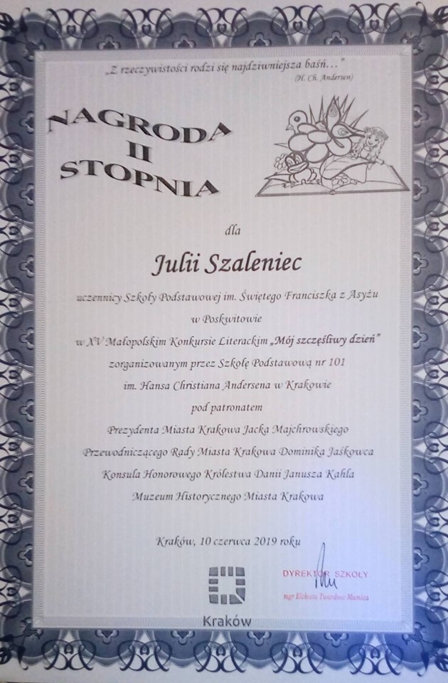 Hans Christian Andersen w baśni „Stokrotka” napisał: "…skowronek zleciał na dół, ale nie do piwonii ani tulipanów – nie: sfrunął w trawę do biednej stokrotki; radość po prostu przeraziła ją i sama nie wiedziała, co ma myśleć. Ptaszek tańczył dookoła stokrotki i śpiewał (…). Jakże szczęśliwa była (…) – to trudno sobie wyobrazić". W tym roku ten fragment stał się inspiracją dla uczestników konkursowych zmagań XV MAŁOPOLSKIEGO KONKURSU LITERACKIEGO I PLASTYCZNEGO Mój szczęśliwy dzień, a ich zadaniem było opowiedzieć o najszczęśliwszym dniu w swoim życiu lub w życiu baśniowych bohaterów. W kategorii literackiej swoich sił próbowali uczniowie klasy IV i VIII z naszej szkoły. Ich prace podejmowały bardzo różnorodne interpretacje szczęścia, więc czytało się je z ogromną przyjemnością. Nie dziwi mnie fakt, iż wśród laureatów konkursu znaleźli się ich przedstawiciele: Daniel Celej i Julia Szaleniec z klasy IV. Zdobyli oni równorzędne nagrody II stopnia i wraz z opiekunami uczestniczyli w uroczystej gali 10 czerwca 2019 roku w Sali Miedzianej Muzeum Historycznego Miasta Krakowa. W trakcie imprezy zostały zaprezentowane fragmenty ich prac i laureaci odebrali swoje nagrody. Z całego serca gratuluję wspaniałych pomysłów wszystkim uczestnikom konkursu. Gratuluję Julce i Danielowi i życzę dalszych sukcesów.