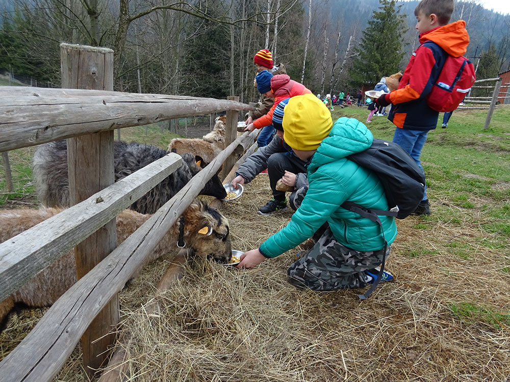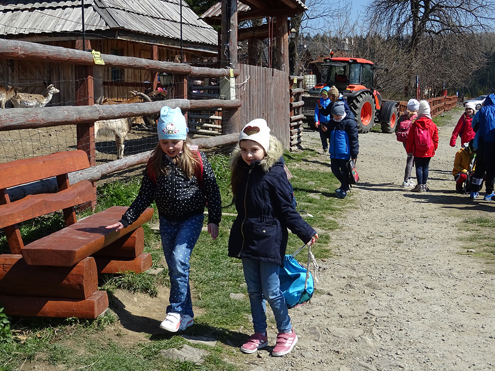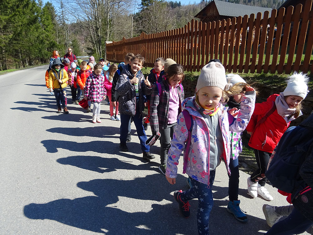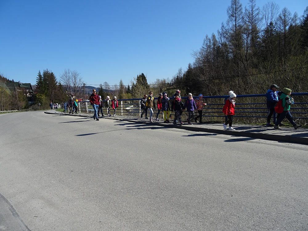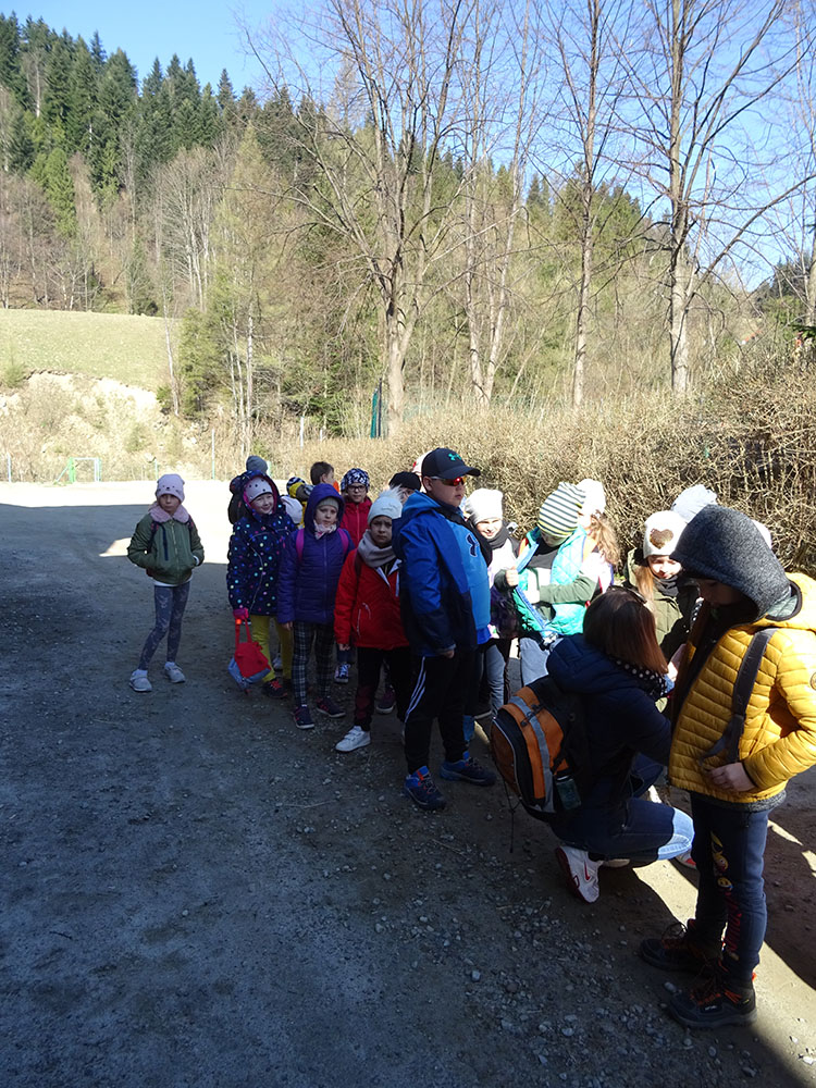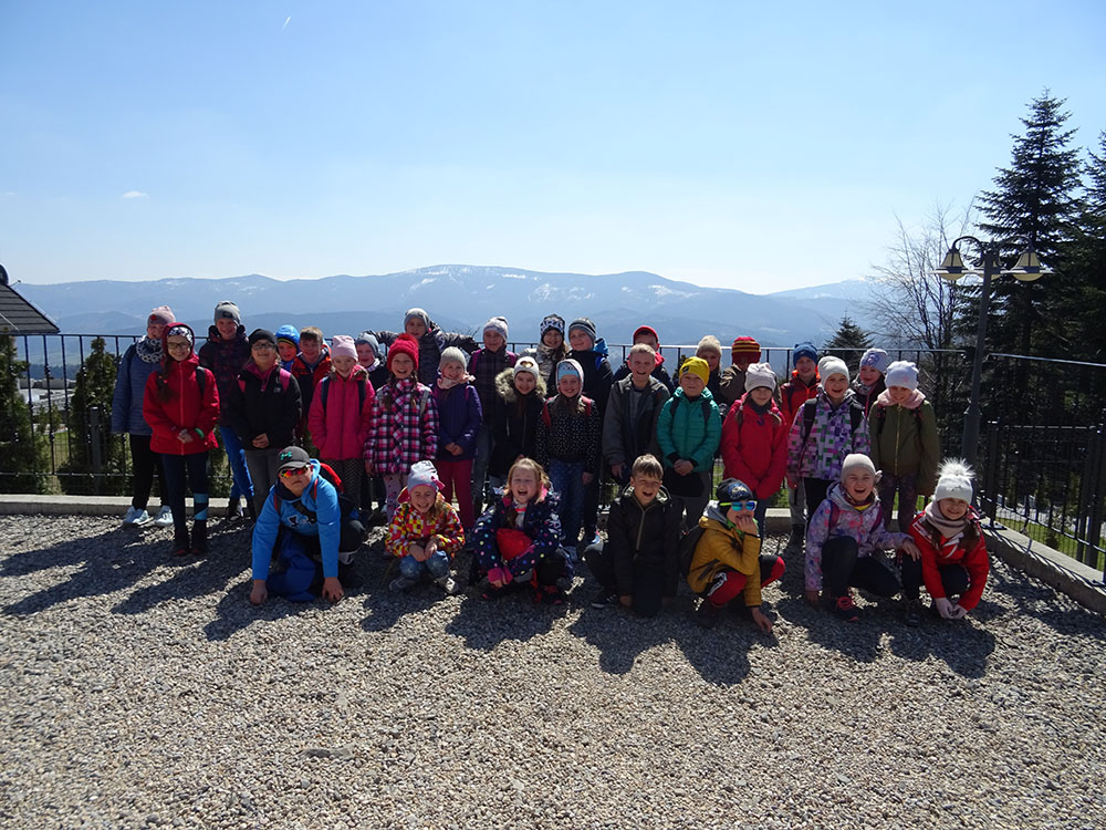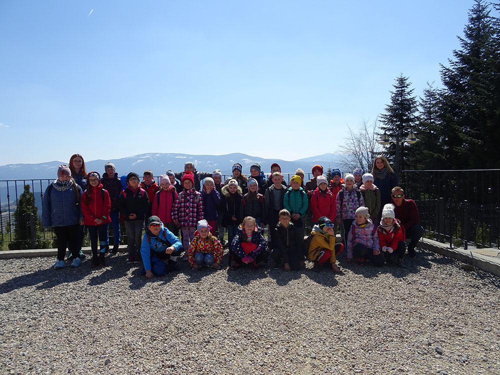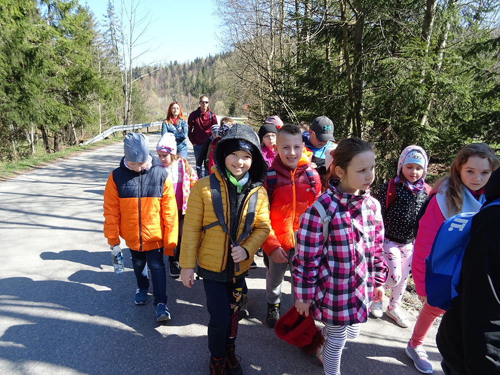 Dnia 15 kwietnia 2019 r. punktualnie o godzinie 8.00 przed szkołą zebrała się 33 – osobowa grupa uczniów z klas I – IV. Ten dzień był długo wyczekiwany przez wszystkich uczestników wyjazdu na trzydniową wycieczkę do Zawoi. Pierwszym punktem programu było wyjście na Przysłop i znajdującą się tam wieżę widokową, z której można podziwiać panoramę na Beskid Śląski i Beskid Żywiecki. Po zejściu uczniowie mogli nakarmić i pogłaskać zwierzęta w sąsiadującej zagrodzie obok wieży. Następnie udaliśmy się do ośrodka, gdzie uczniowie zostali przydzieleni do właściwych pokoi, zanieśli tam swoje walizki, rozpakowali je i nie mogli doczekać się atrakcji. Kolejnym punktem programu były zajęcia z szycia. Niektórzy po raz pierwszy trzymali igłę w dłoni. Pomimo to, świetnie poradzili sobie z tym zadaniem i owieczki z filcu wyszły przepięknie! Każdy swoje dzieło zabrał na pamiątkę do domu. Pogoda w tym dniu sprzyjała więc przed kolacją udaliśmy się na zabawy wokół ośrodka – wielbiciele piłki nożnej mogli rozegrać mecz, a pozostali chętnie pobawili się w berka. Na zakończenie dnia odbyło się spotkanie z miejscowymi góralami, którzy zaprezentowali góralskie stroje, przyśpiewki, ciekawostki, a przede wszystkim góralską gwarę. Pełni wrażeń po całym dniu wszyscy udali się do pokoi na zasłużony odpoczynek.