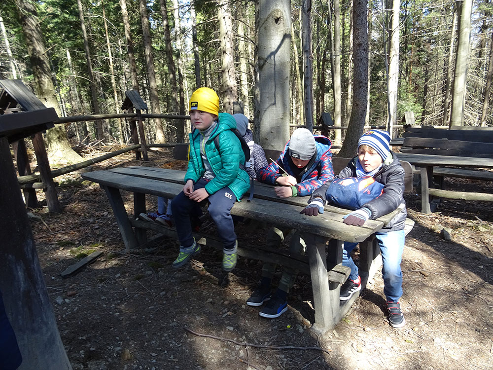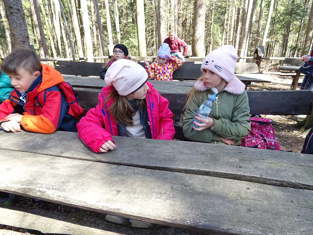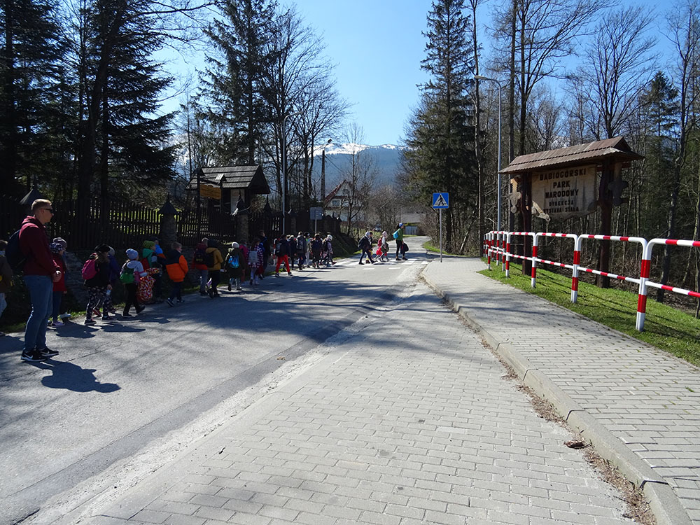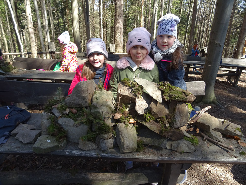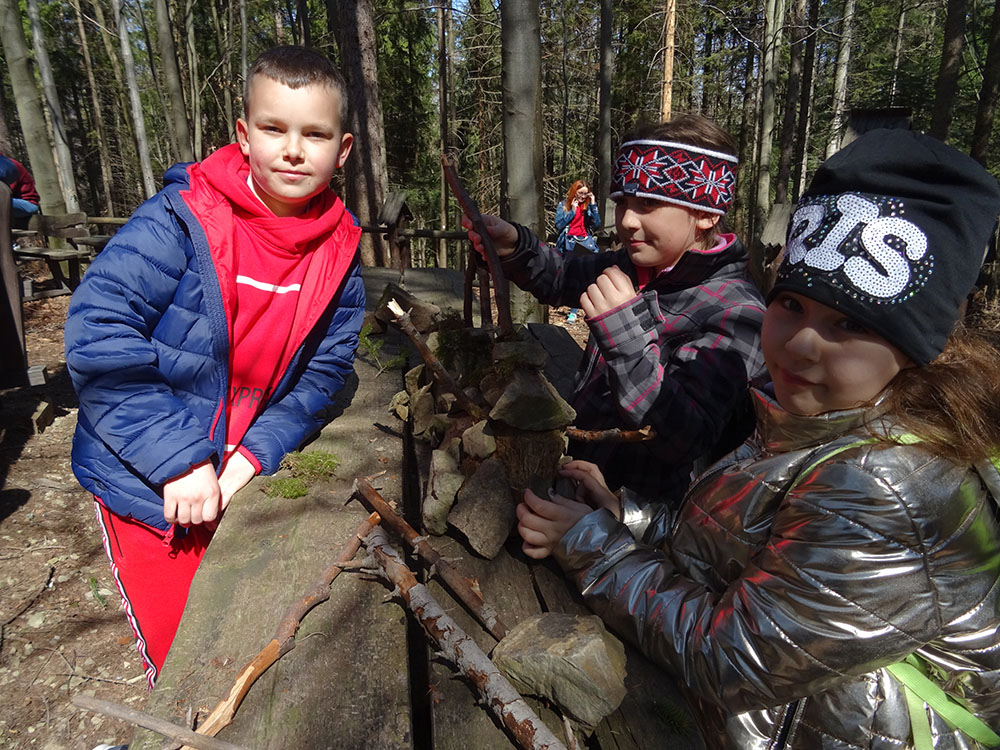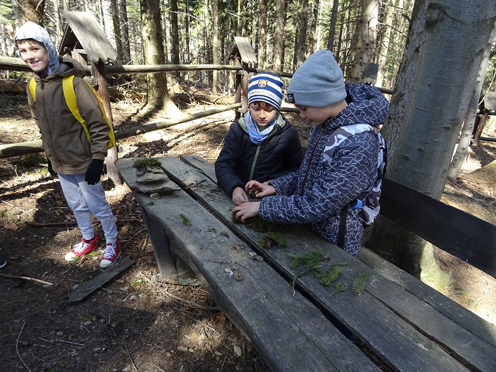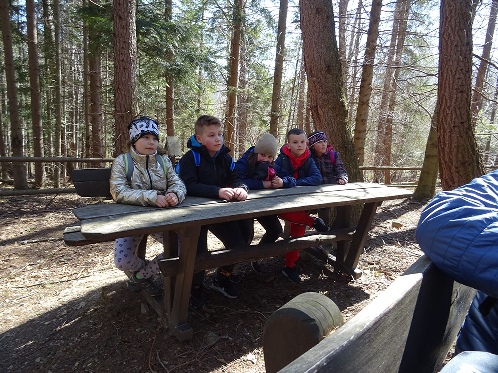 W tym dniu czekała nas górska wyprawa. Słońce pięknie świeciło, a więc pogoda idealna na dłuższy spacer. Zaraz po śniadaniu wraz z Panią Przewodnik wybraliśmy się na Mokry Kozub. Na szczycie znajdowała się „Leśna Klasa” – stoliki, ławki, tablica – prawie jak w szkole. Po krótkiej opowieści o Babiej Górze uczniowie w grupach budowali swoje „Babie Góry” z dostępnych materiałów. Wyobraźnia zadziałała, a efekty zostały uwiecznione na zdjęciach. Wyprawa była długa, mimo to wszyscy z uśmiechem na twarzy wrócili do ośrodka. Po obiedzie zebraliśmy się na zajęciach z „Eko – sianka”. Tym razem każdy wykonał sobie na pamiątkę wielkanocnego zajączka . Po tych zajęciach udaliśmy się do pokoi na krótki odpoczynek. Kolejną atrakcją był wirtualny spacer po Babiej Górze, Pan Wojtek opowiedział co można spotkać po drodze na ten szczyt, jaką ma wysokość, ile się na niego wychodzi i kiedy najlepiej wybrać się na taką wędrówkę. Nauczyliśmy się też śpiewać przyśpiewki po góralsku. Wydawać by się mogło, że jak na jeden dzień to wystarczyło by atrakcji, jednak nie. Po kolacji nastąpił czas zabawy. Po podzieleniu na grupy uczniowie brali udział w różnych konkurencjach -rozwiązywali zadania, odpowiadali na pytania w quizie, grali na instrumentach, a na koniec każdy dostał nagrodę w postaci cukierków. Zmęczeni, ale zadowoleni wszyscy udali się do pokoi – tam na każdego czekało jeszcze jedno zadanie – pakowanie. Gdyż następnego dnia wczesnym rankiem opuszczaliśmy Zawoję.
