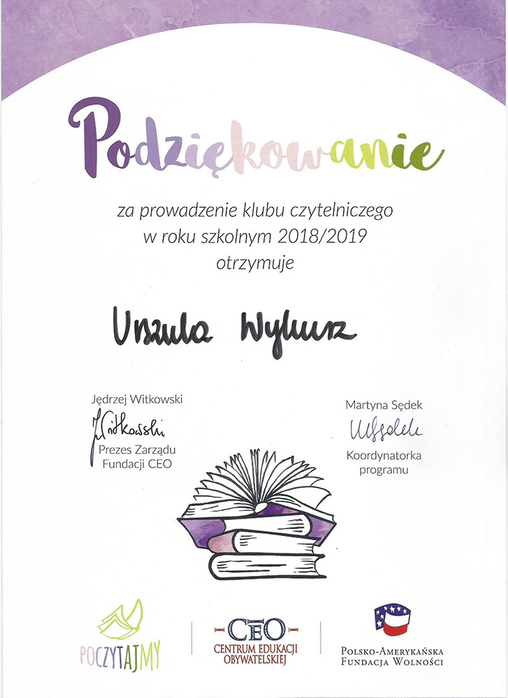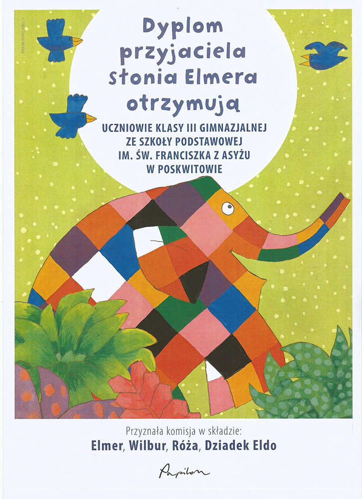 Uczniowie klasy III gimnazjalnej uczestniczyli w roku szkolnym 2018/2019 w ogólnopolskim programie czytelniczym PoczytajMy, którego organizatorem jest Centrum Edukacji Obywatelskiej w Warszawie. Gimnazjaliści odwiedzali swoich młodszych kolegów z oddziału przedszkolnego oraz z klasy pierwszej, prowadzili poranki czytelnicze, wymyślali gry i zabawy. Spotkanie z sympatycznym słonikiem w kratkę, bohaterem książek Davida McKee, stało się inspiracją do tworzenia wspaniałych bajek, kołysanek oraz baśniowych ilustracji. Tak powstał projekt „Od Elmera do Efiego”, którego autorami byli Zuzanna Krawiecka i Piotr Krawiecki. Ich prace nagrodzone zostały przez Grupę Wydawniczą Publicat pięknymi dyplomami oraz książkami o wartości 423 zł.