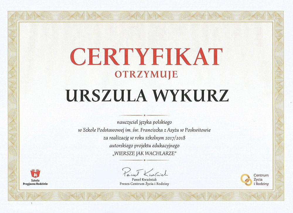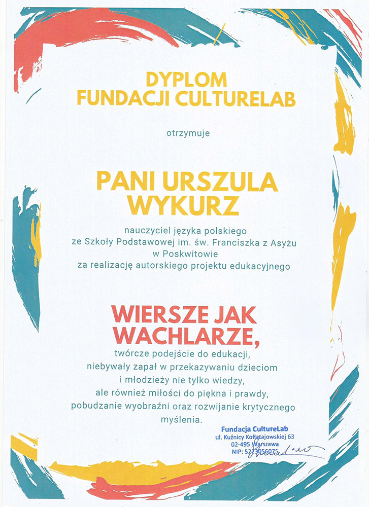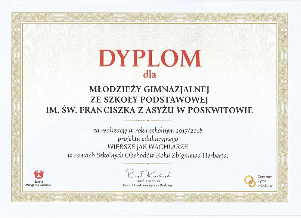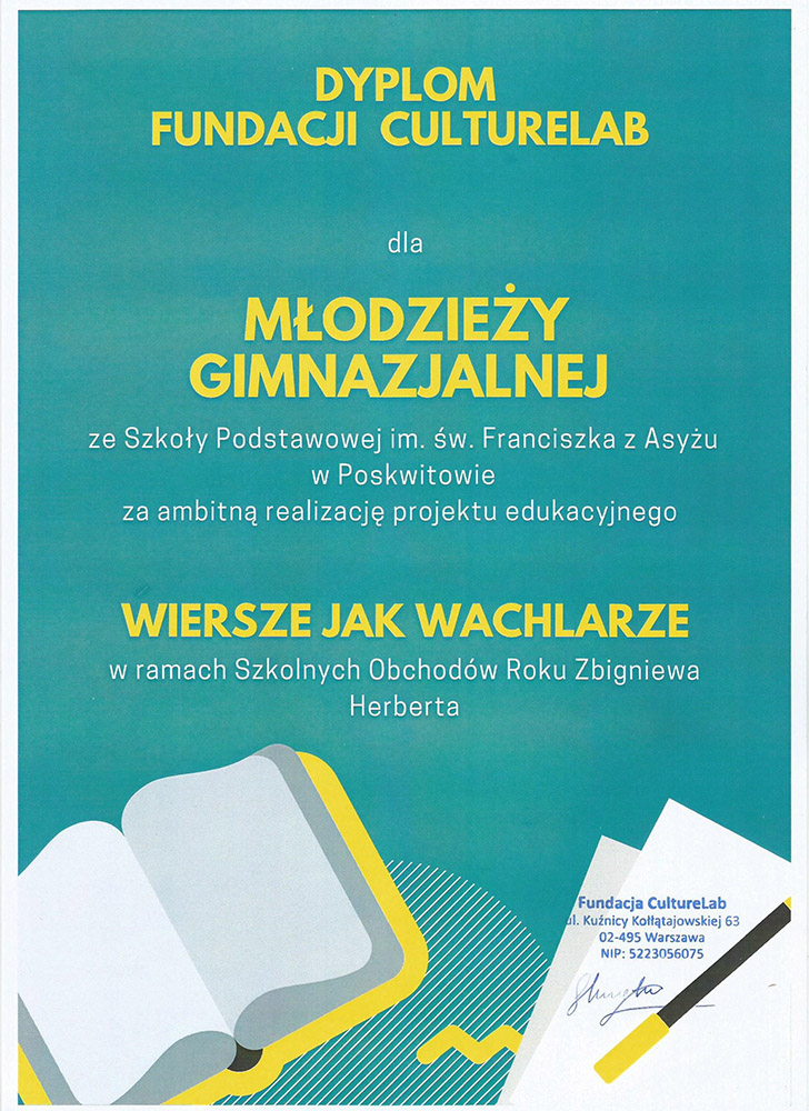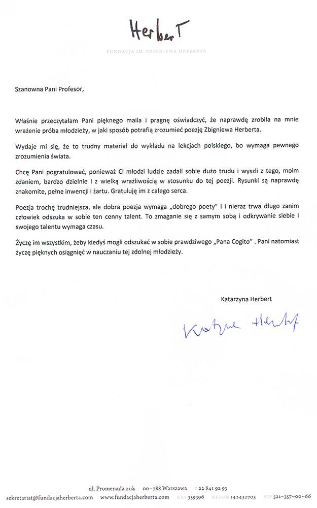 Zadania projektowe gimnazjalistów zostały nagrodzone przez Fundację CultureLab z Warszawy, Centrum Wspierania Inicjatyw dla Życia i Rodziny oraz redaktor naczelną miesięcznika dla licealistów „Cogito”. Największym wyróżnieniem i ogromnym zaszczytem była współpraca z Fundacją im. Zbigniewa Herberta w Warszawie. Uczniowie otrzymali list gratulacyjny od pani Katarzyny Herbert, małżonki Poety.