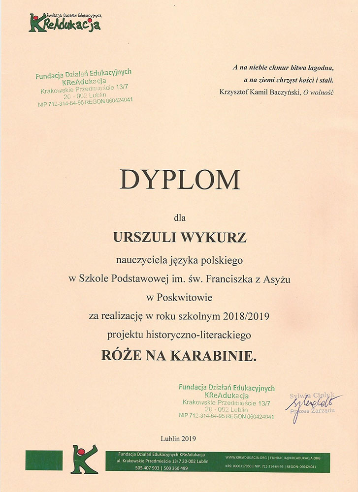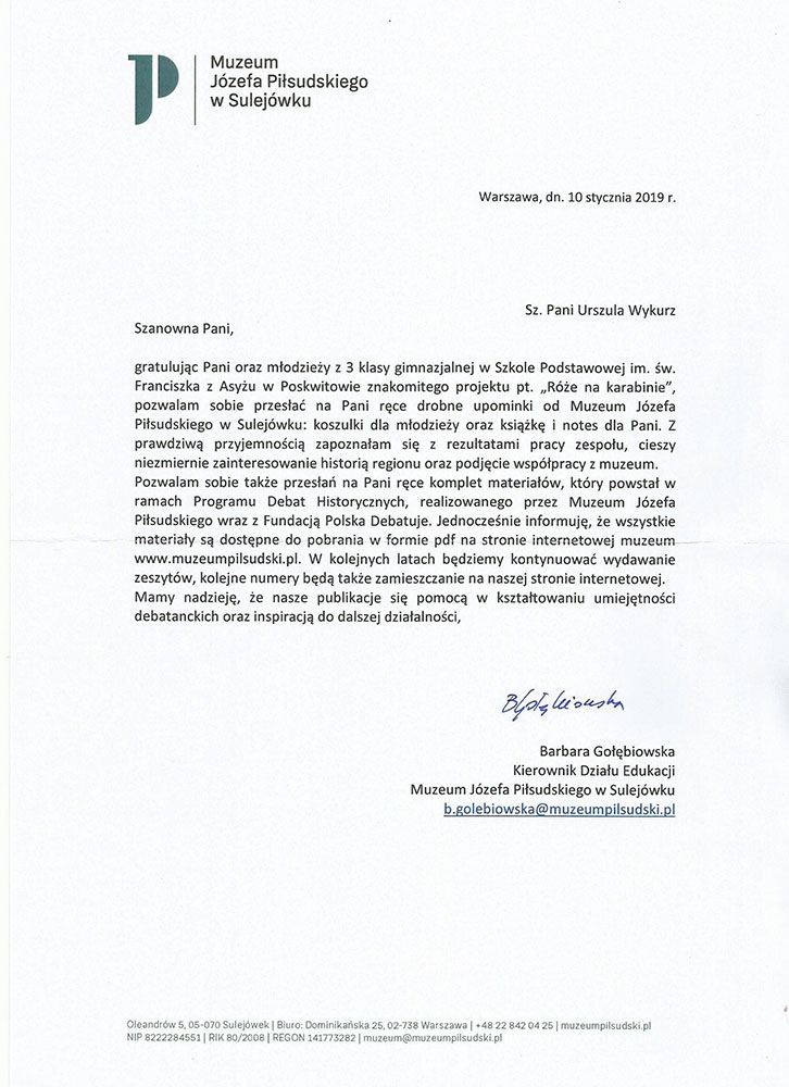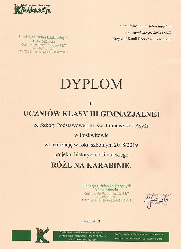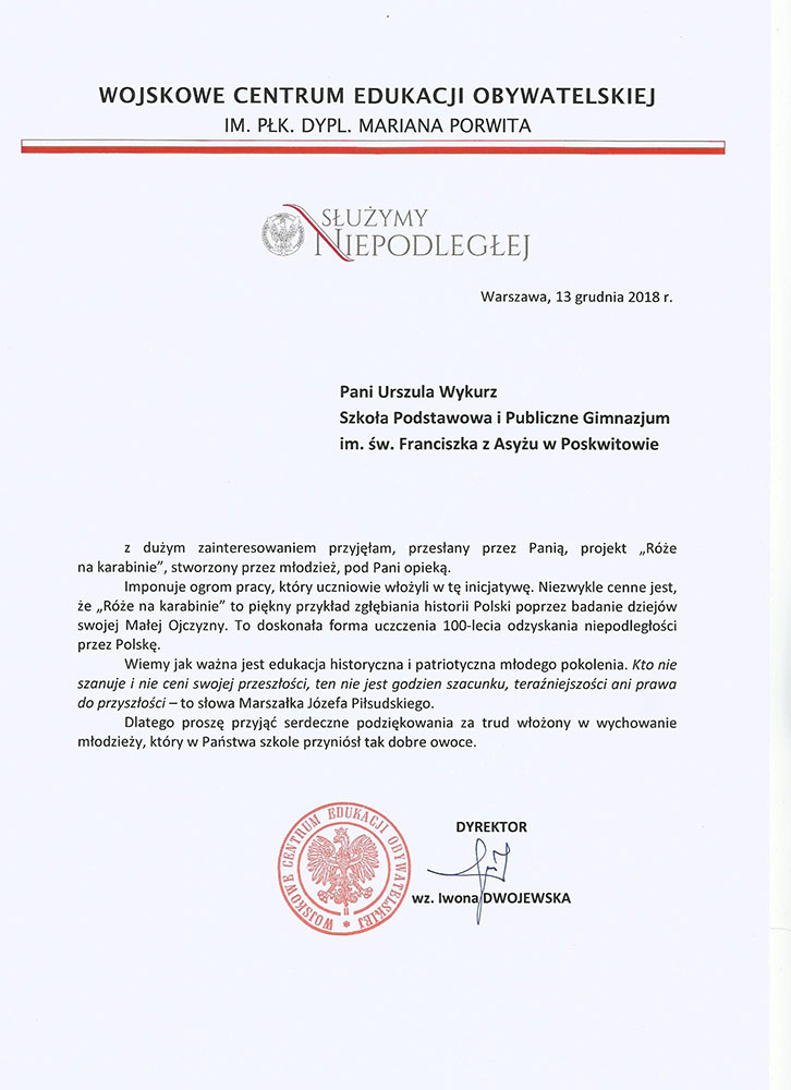 Uczniowie klasy III gimnazjum realizowali w I okresie roku szkolnego 2018/2019 projekt literacko-historyczny „Róże na karabinie”. Poznali biografie żołnierzy z Iwanowic, Maszkowa, Poskwitowa, Sieciechowic, redagowali opowiadania o bohaterach walk narodowo-wyzwoleńczych, tworzyli pamiętniki, pisali listy z okopów.