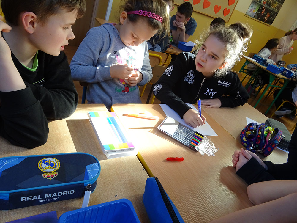 W tym roku nasza Szkoła po raz pierwszy wzięła udział w - organizowanym przez Fundację Dbam o Mój Zasięg - projekcie „IDĄ ŚWIĘTA – NIE O SMS-IE, LECZ O KARTCE PAMIĘTAJ”. Projekt polegał na tworzeniu i wysyłaniu kartek świątecznych w okresie Świąt Bożego Narodzenia 2018r. Nasi uczniowie bardzo chętnie włączyli się do akcji – Ci najmłodsi dostali kartki do domu, aby je wysłać do swoich bliskich, a także wypisali własnoręcznie kartki dla podopiecznych z zaprzyjaźnionego z nami Domu Dziecka w Pszczynie. Natomiast uczennice z Samorządu Uczniowskiego wypisały kartki dla osób starszych przebywających w Hospicjum w Miechowie. W sumie ponad 100 kartek bożonarodzeniowych zostało wysłanych. Mamy nadzieję, że sprawiły odbiorcom wiele radości.