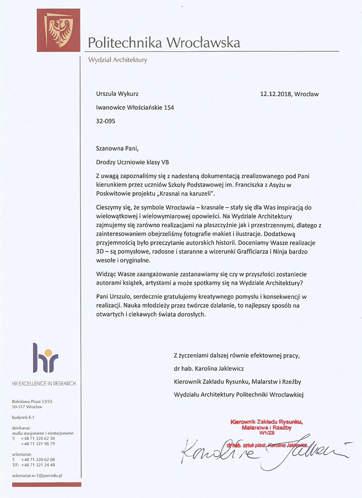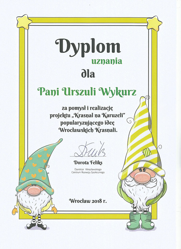 Naszym przedsięwzięciem zachwyciła się pani dr hab. Karolina Jaklewicz, kierownik Zakładu Rysunku, Malarstw i Rzeźby Wydziału Architektury Politechniki Wrocławskiej. Projekt „Krasnal na karuzeli” został nagrodzony przez Towarzystwo Przyjaciół Wrocławia oraz Wrocławskie Centrum Rozwoju Społecznego. Uczniowie otrzymali dyplomy, gry planszowe, krasnoludkowe mapki Wrocławia, układanki matematyczne, kolorowe torby. Wartość nagród wyniosła 820 zł.