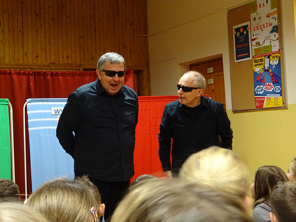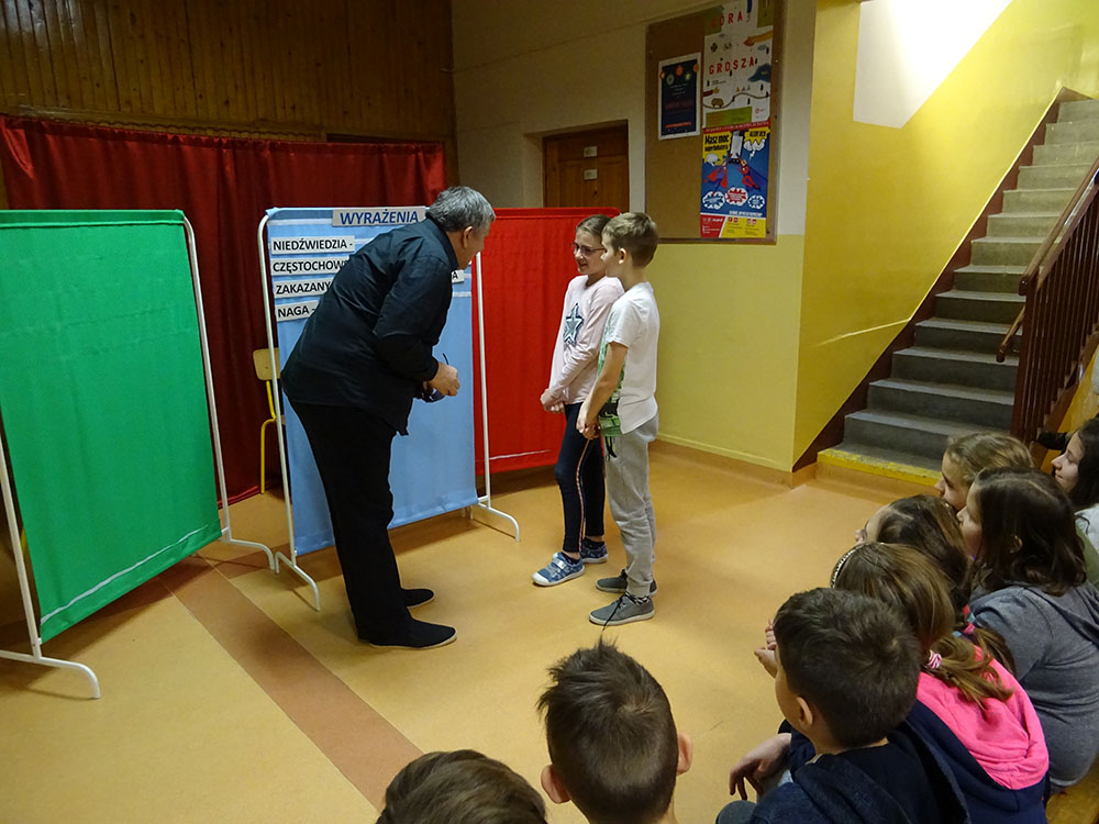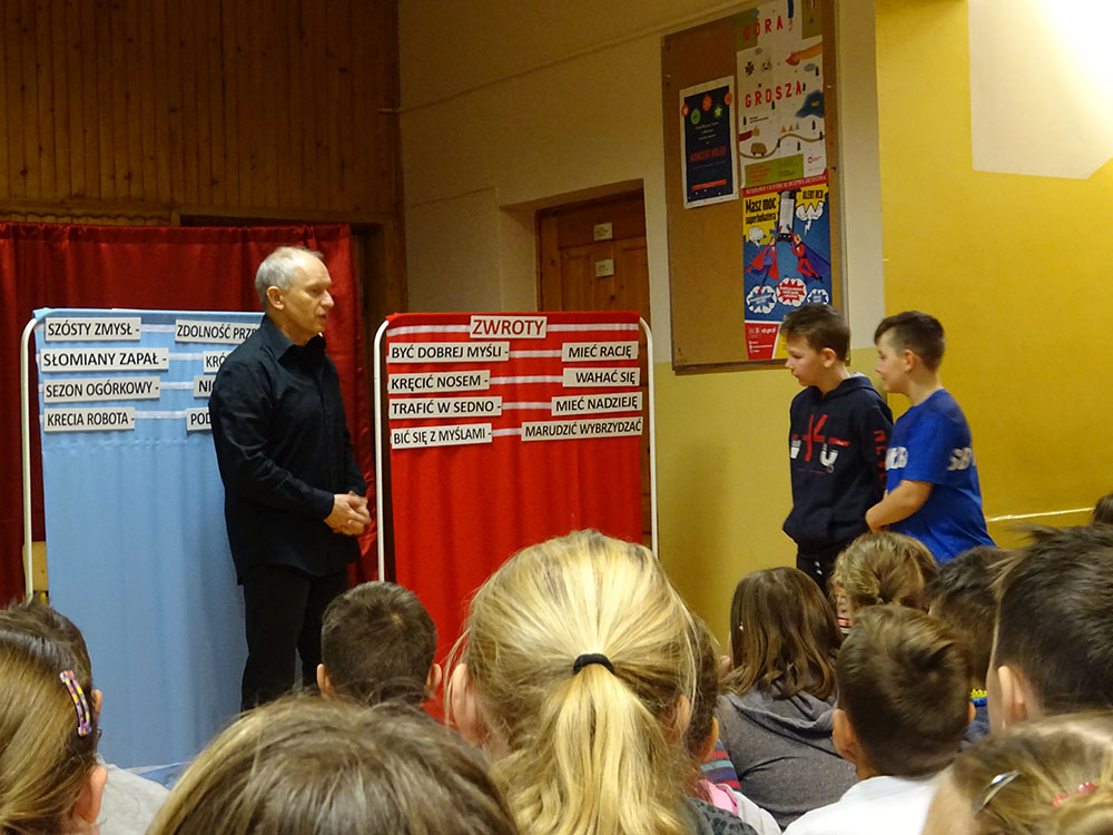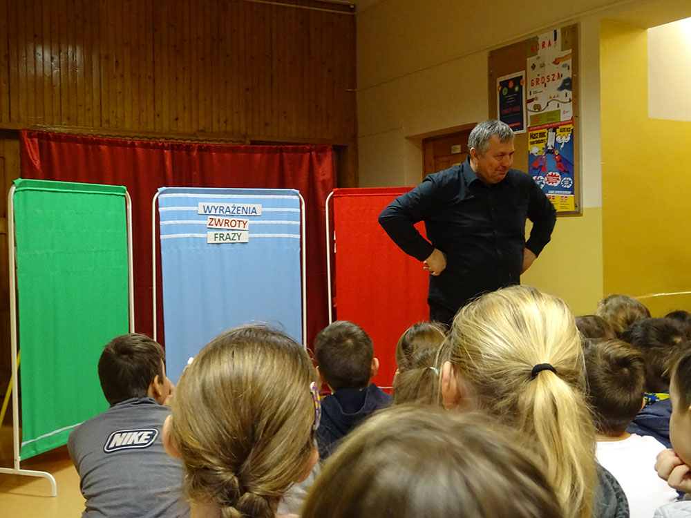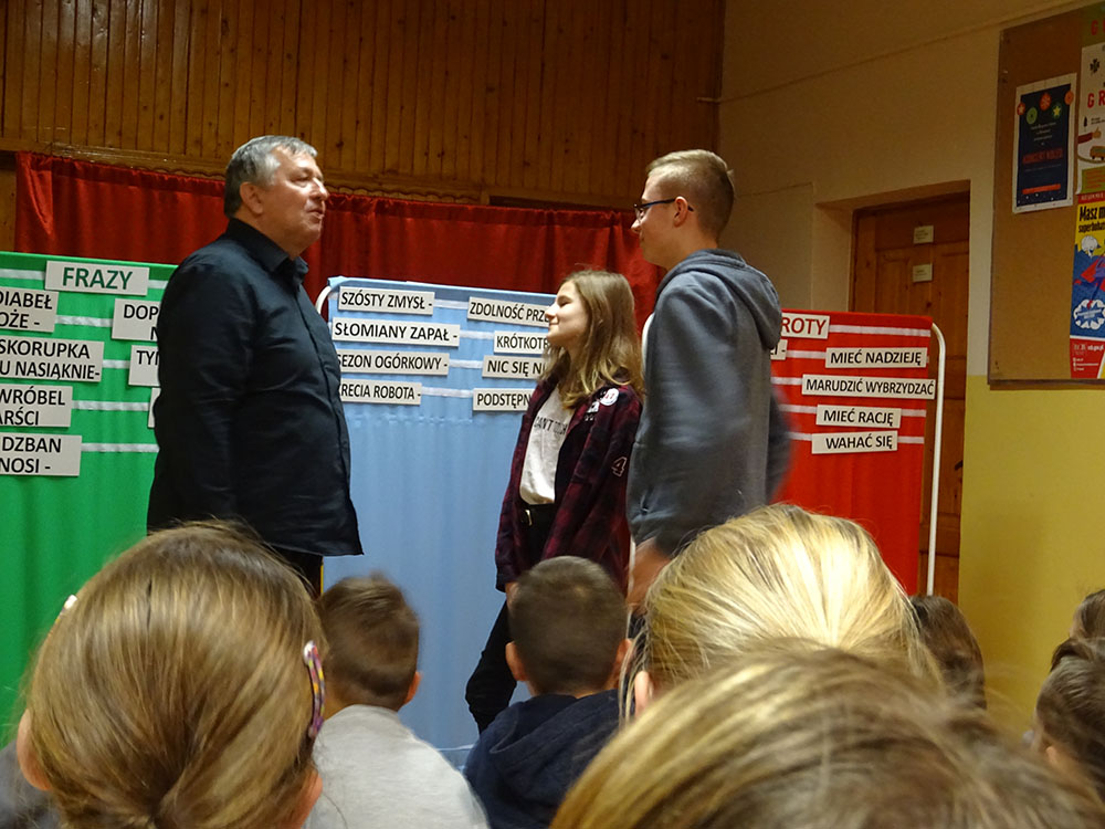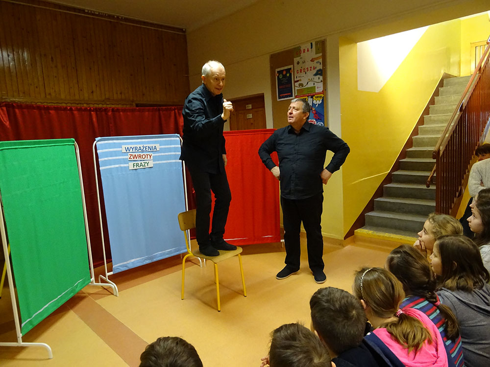 Gościliśmy w naszej szkole wspaniały aktorski duet. Byli to panowie z agencji artystycznej Invest-Art.: Wojciech Hrabela i Jacek Lecznar. Zaprezentowali oni spektakl przybliżający dzieciom i młodzieży związku frazeologiczne. Przedstawienie miało charakter interaktywny; wybrani uczniowie mieli możliwość pokazania, iż zapamiętali frazeologizmy i potrafią je objaśnić. Spektakl budził żywą reakcję publiczności i salwy śmiechu. Mamy nadzieję, że wiedza zdobyta przez naszych uczniów została uzupełniona i utrwalona.
