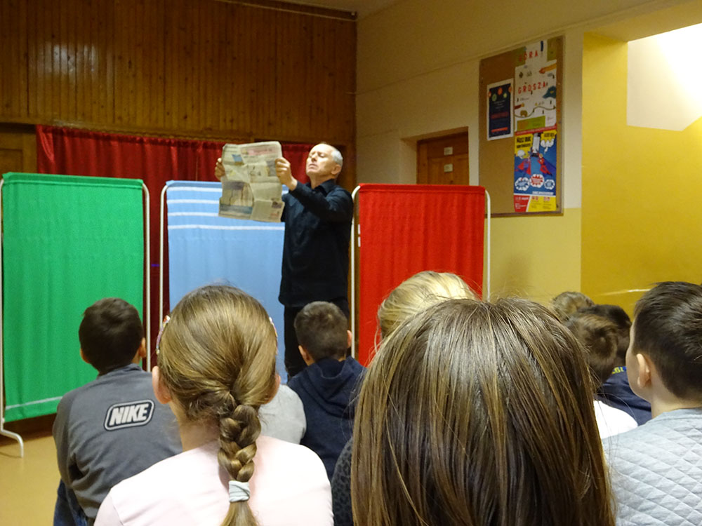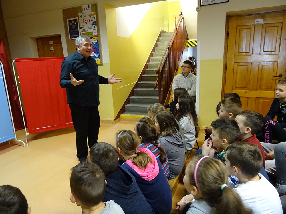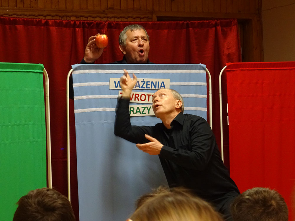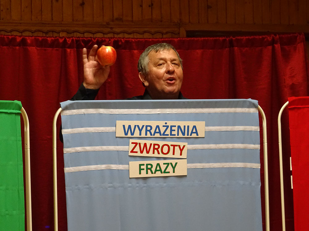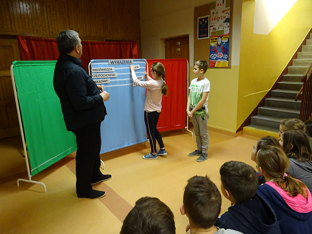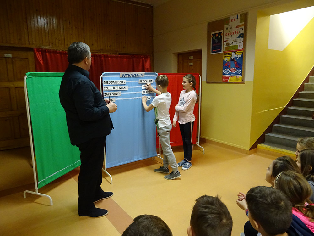 Gościliśmy w naszej szkole wspaniały aktorski duet. Byli to panowie z agencji artystycznej Invest-Art.: Wojciech Hrabela i Jacek Lecznar. Zaprezentowali oni spektakl przybliżający dzieciom i młodzieży związku frazeologiczne. Przedstawienie miało charakter interaktywny; wybrani uczniowie mieli możliwość pokazania, iż zapamiętali frazeologizmy i potrafią je objaśnić. Spektakl budził żywą reakcję publiczności i salwy śmiechu. Mamy nadzieję, że wiedza zdobyta przez naszych uczniów została uzupełniona i utrwalona.