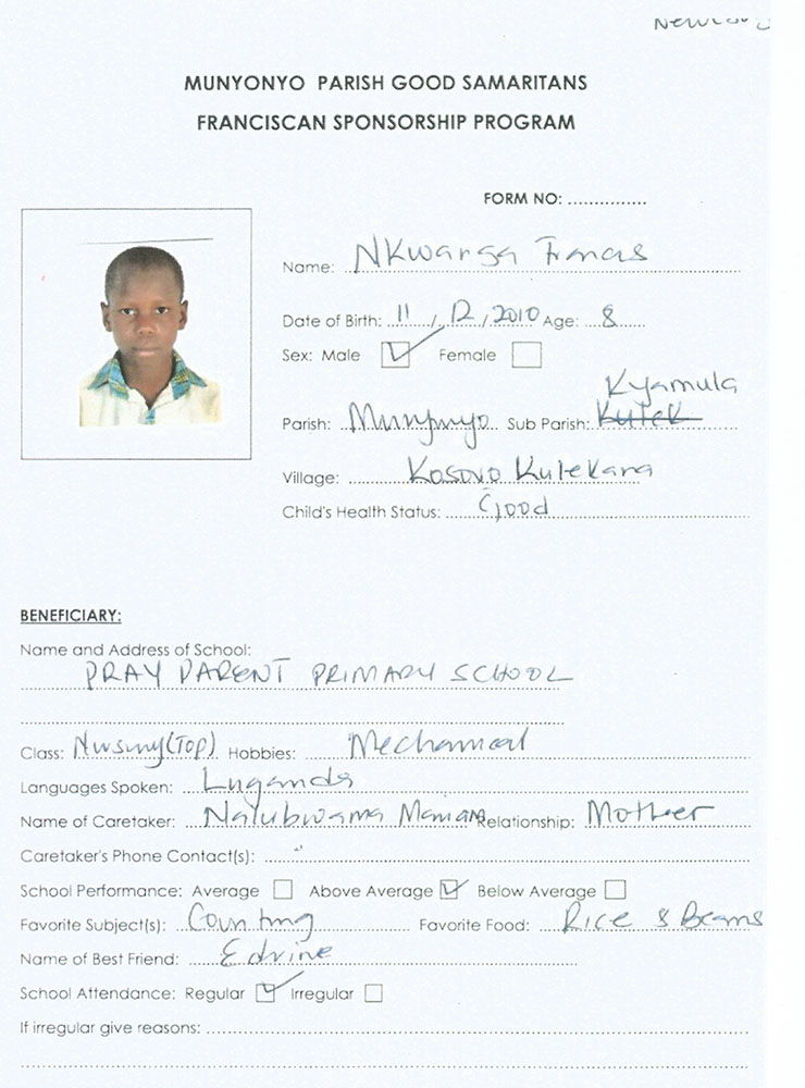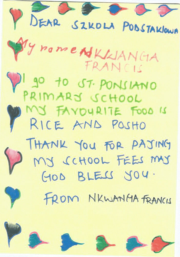 Nasza szkoła „adoptowała” chłopca Nkwanga Francisa z Ugandy. Dzięki naszej pomocy chłopiec ten będzie mógł zjeść wartościowy posiłek, zdobyć wykształcenie, które pozwoli mu się usamodzielnić. Otrzymaliśmy od niego list, który poniżej publikujemy oraz informacje o nim. Zachęcamy wszystkich do włączenia się w akcję „Adopcja serca”.
