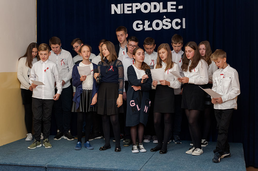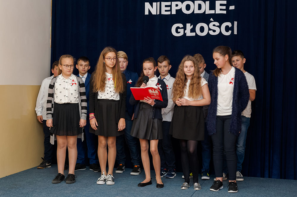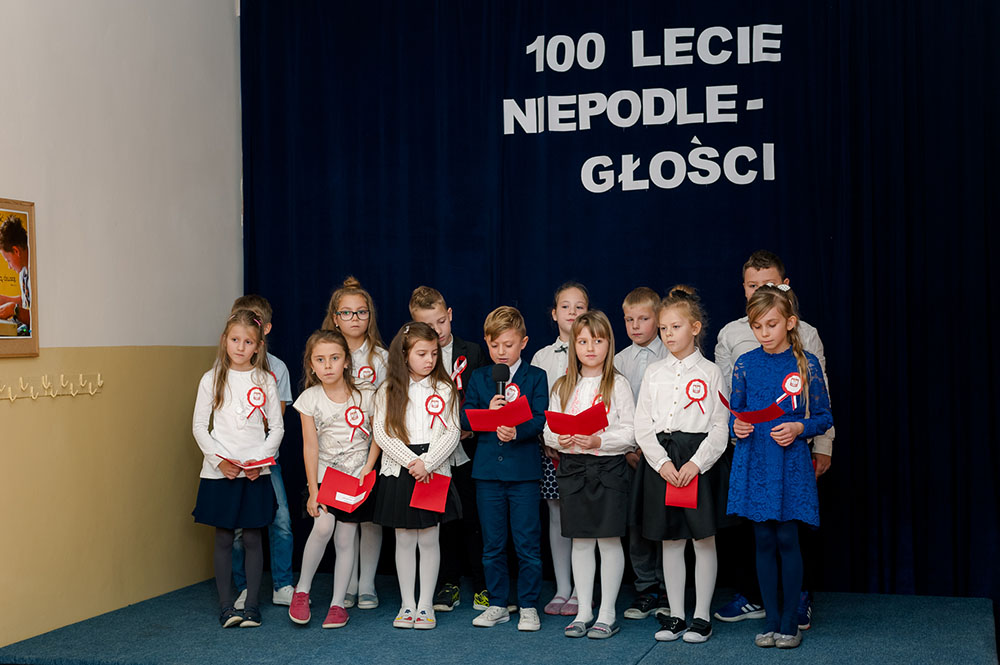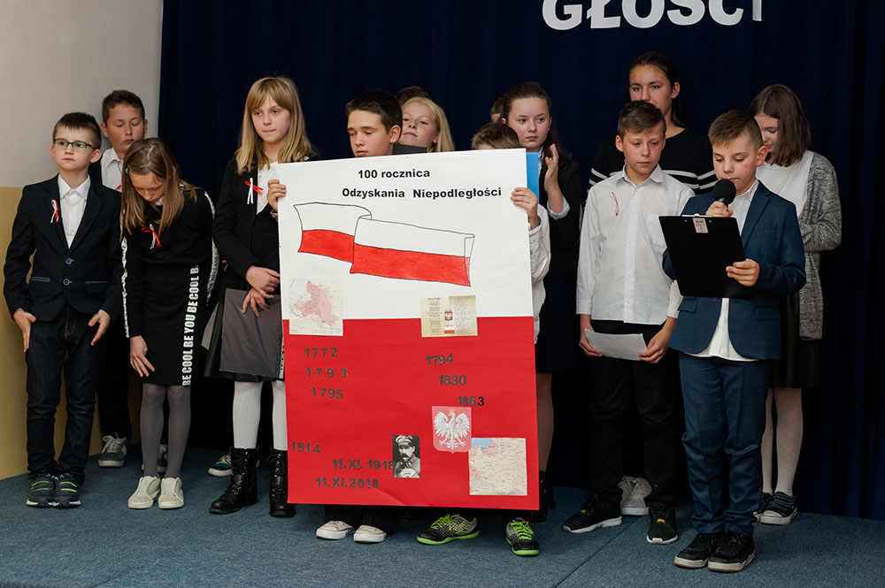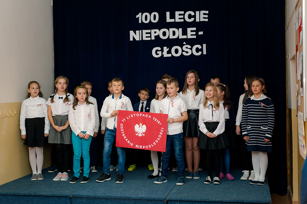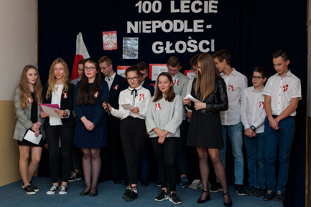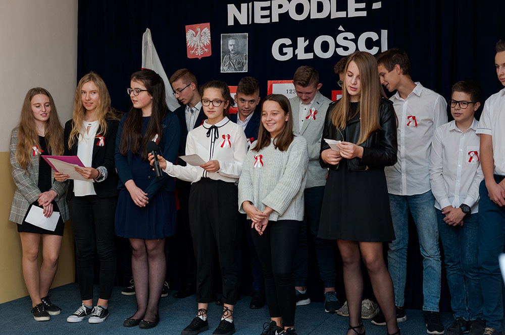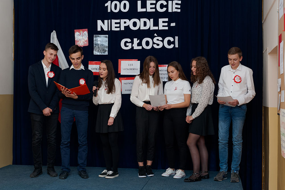 Z tej okazji w naszej szkole 7 listopada został zorganizowany Dzień Obchodów Święta Niepodległości. Uczniowie uroczyście uczcili tę rocznicę. Każda klasa wraz z wychowawcą przygotowała ciekawy program artystyczny, który został zaprezentowany w czasie apelu. Uczniowie śpiewali znane pieśni, przedstawiali plakaty, wiersze, prezentacje multimedialne oraz inscenizacje. Na zakończenie wszyscy wspólnie odśpiewali pieśń „Rota”. Obchody 100 rocznicy odzyskania niepodległości na pewno na długo zapadną w serca i w pamięć naszych uczniów. Wszyscy bardzo aktywnie wzięli w nich udział i włączyli się w przygotowanie święta.