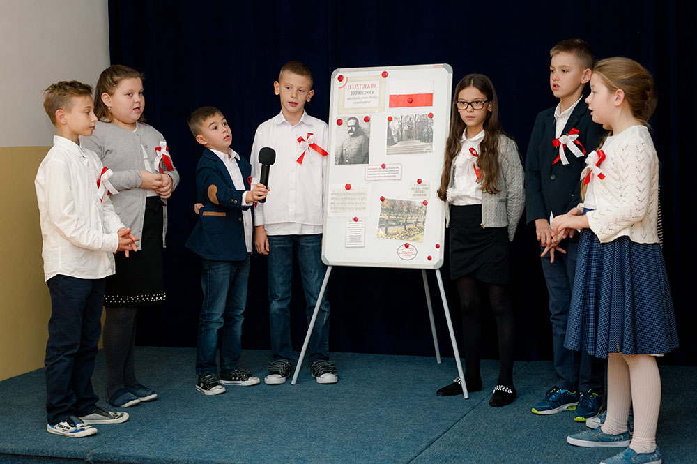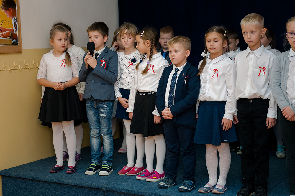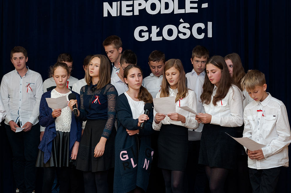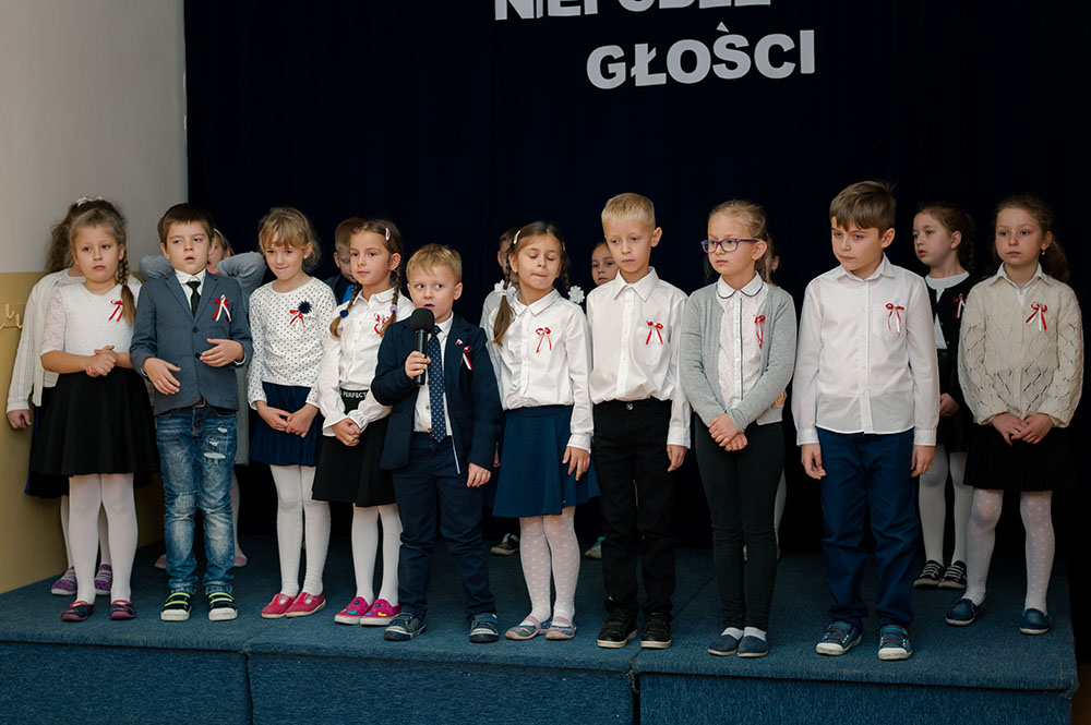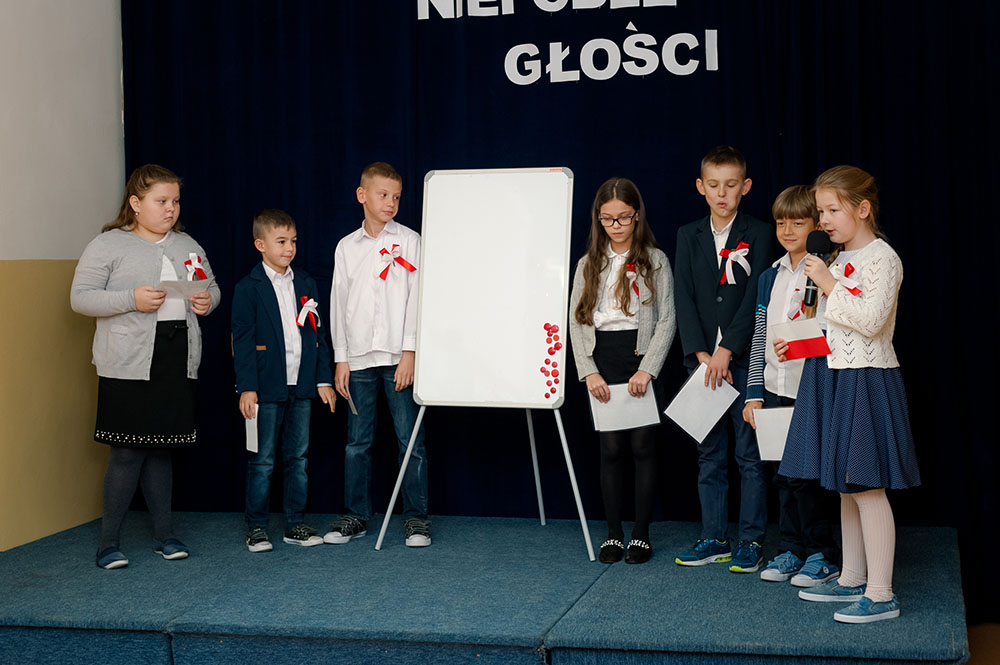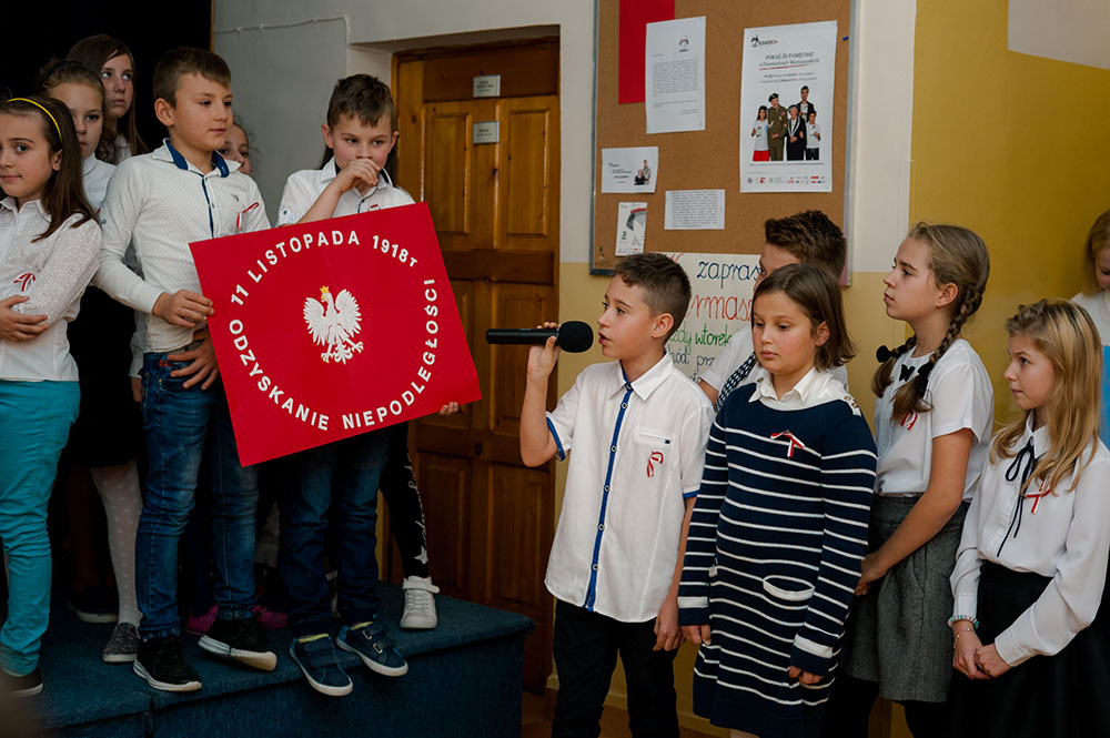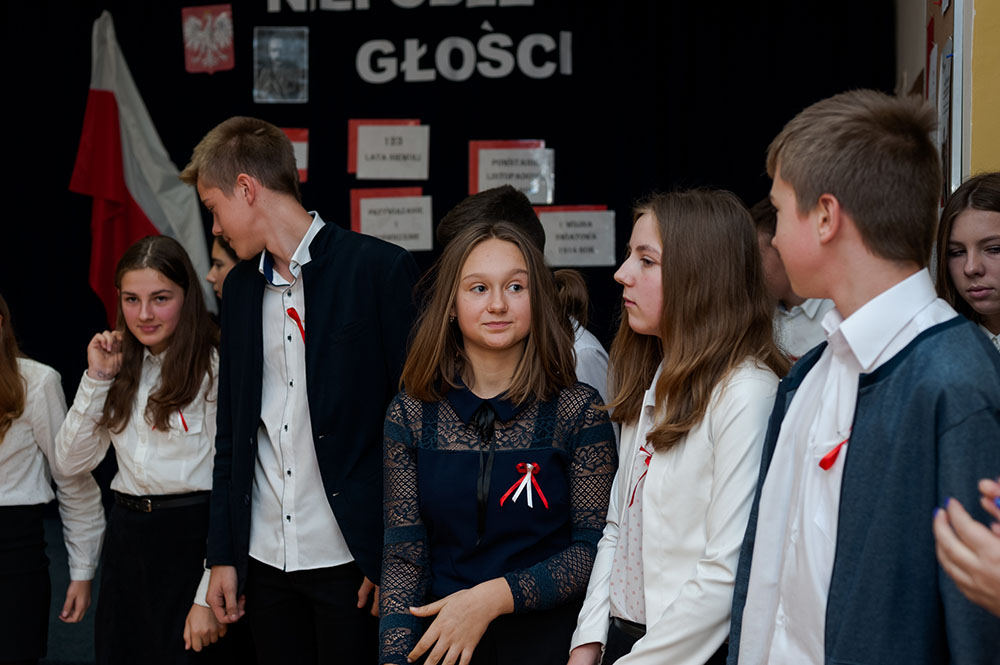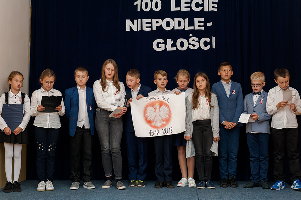 Z tej okazji w naszej szkole 7 listopada został zorganizowany Dzień Obchodów Święta Niepodległości. Uczniowie uroczyście uczcili tę rocznicę. Każda klasa wraz z wychowawcą przygotowała ciekawy program artystyczny, który został zaprezentowany w czasie apelu. Uczniowie śpiewali znane pieśni, przedstawiali plakaty, wiersze, prezentacje multimedialne oraz inscenizacje. Na zakończenie wszyscy wspólnie odśpiewali pieśń „Rota”. Obchody 100 rocznicy odzyskania niepodległości na pewno na długo zapadną w serca i w pamięć naszych uczniów. Wszyscy bardzo aktywnie wzięli w nich udział i włączyli się w przygotowanie święta.