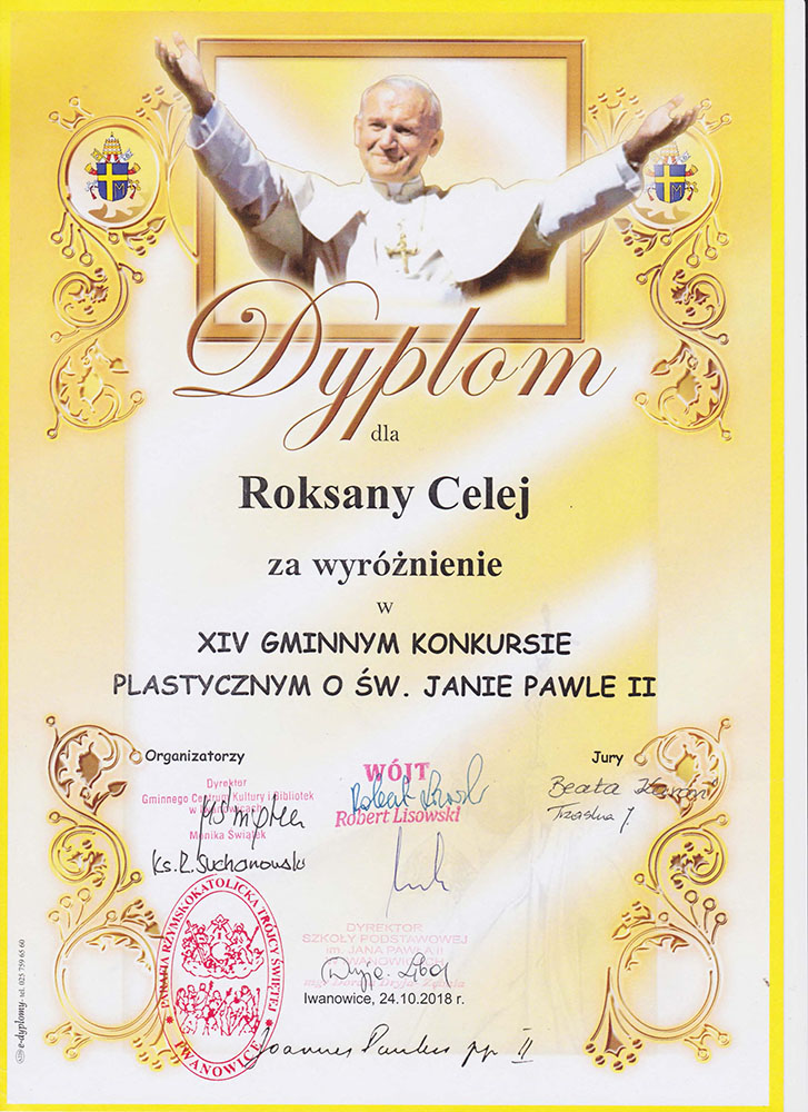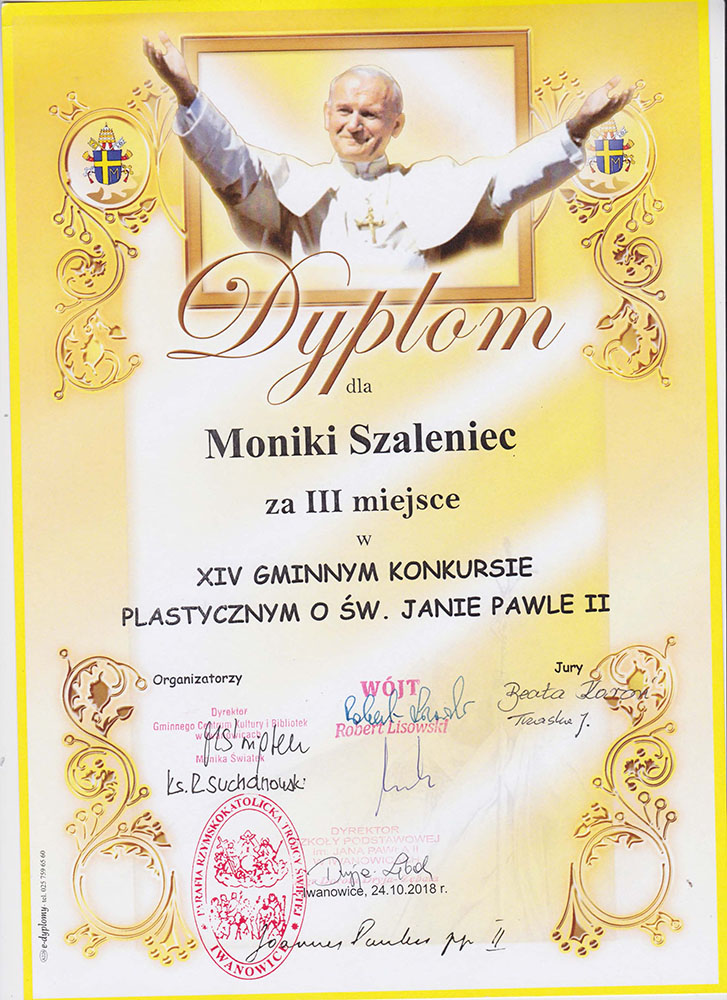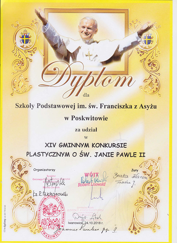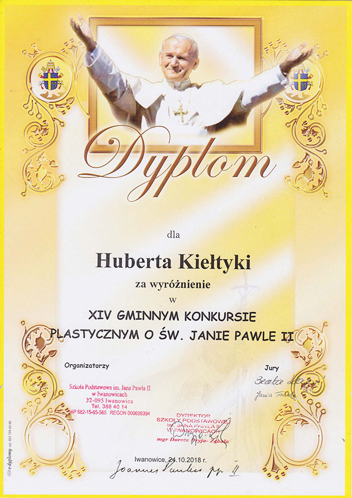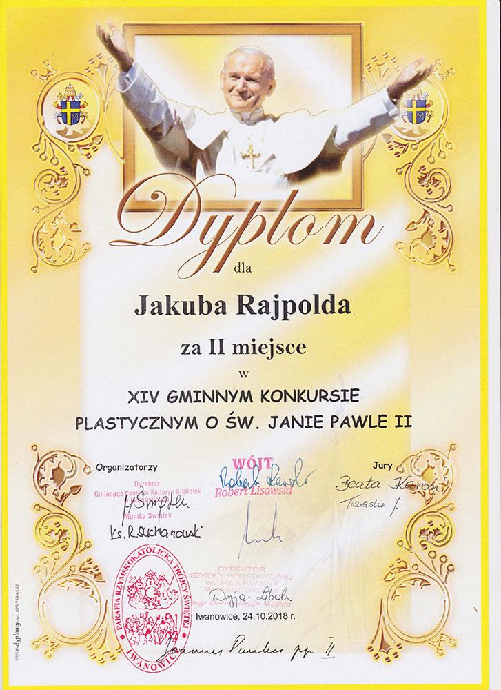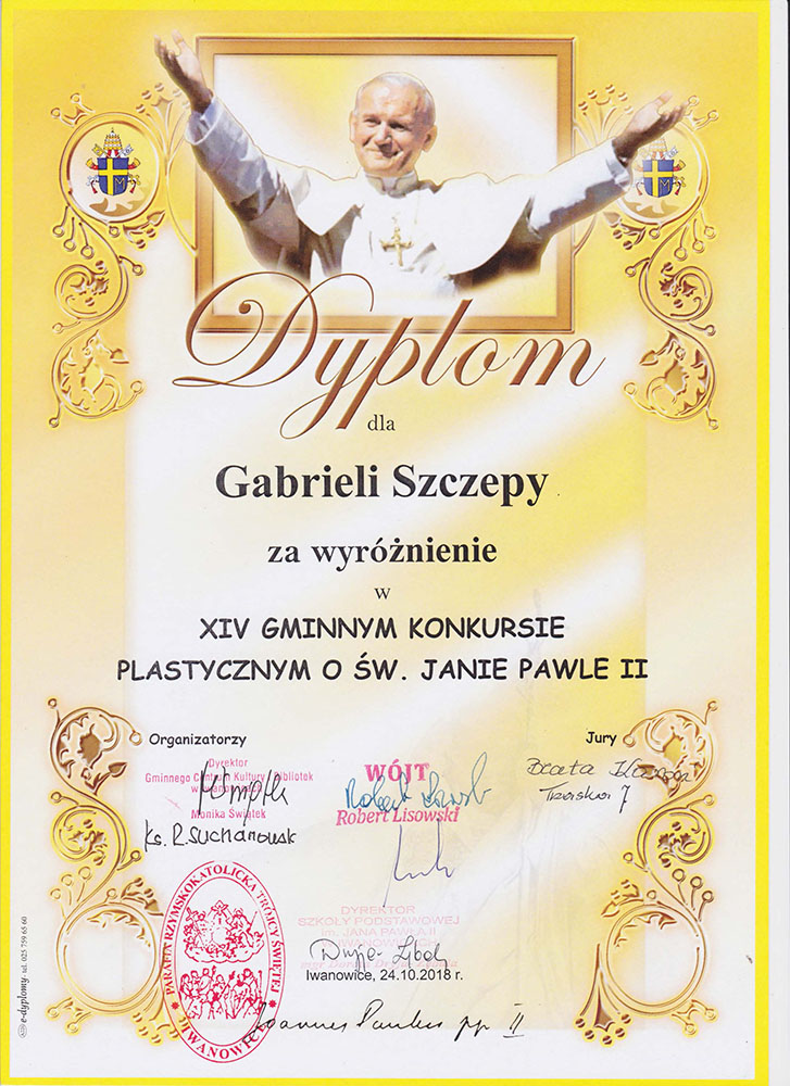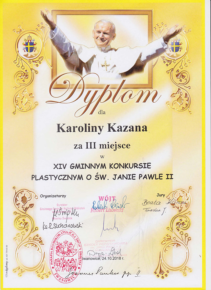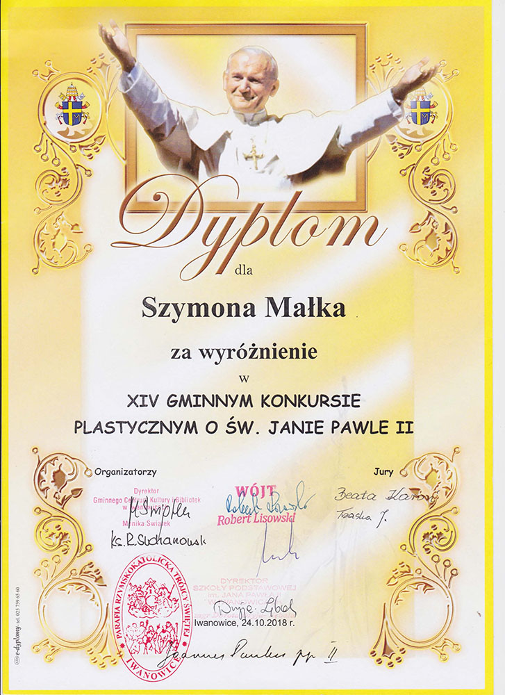 Uczniowie klasy II wzięli udział w Gminnym konkursie plastycznym o św. Janie Pawle II. W tym roku konkurs organizowany był pod hasłem „św. Jan Paweł II blisko nas”