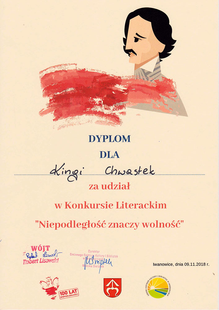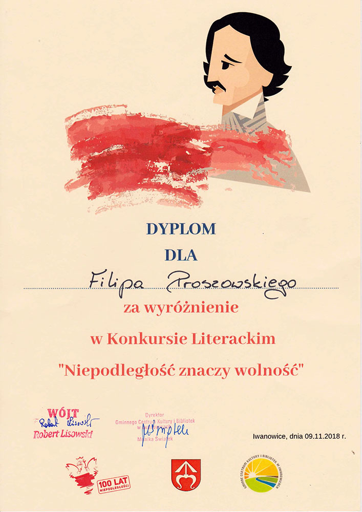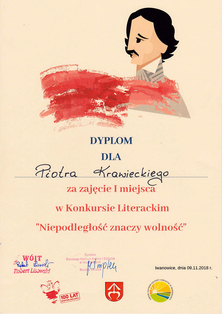 Piotr Krawiecki Opowieść o legionistach, co za Polskę walczyli przez ucznia Krawiciusa ze wsi Poskwitów pochodzącego spisana, z relacji ustnej męża mądrości wielkiej Imć Pana Adama herbu Kustosz usłyszana, przy wsparciu duchowym rodzicieli i pod czujnym okiem preceptora tworzona (I miejsce)