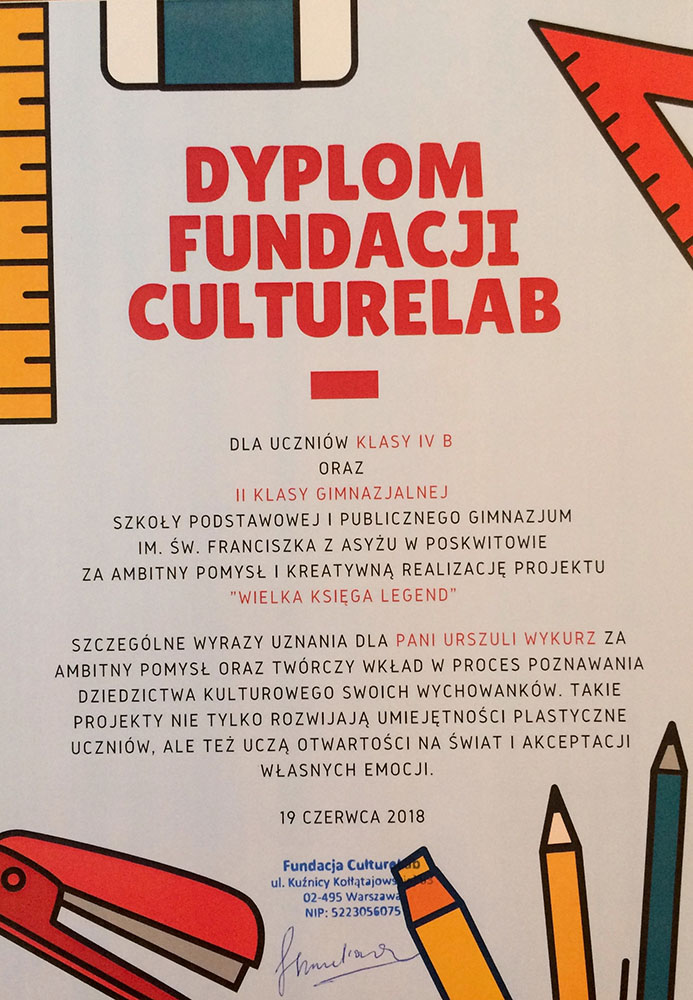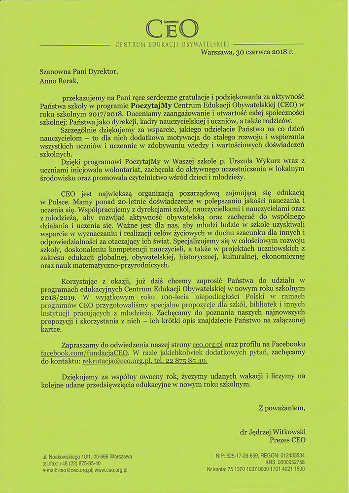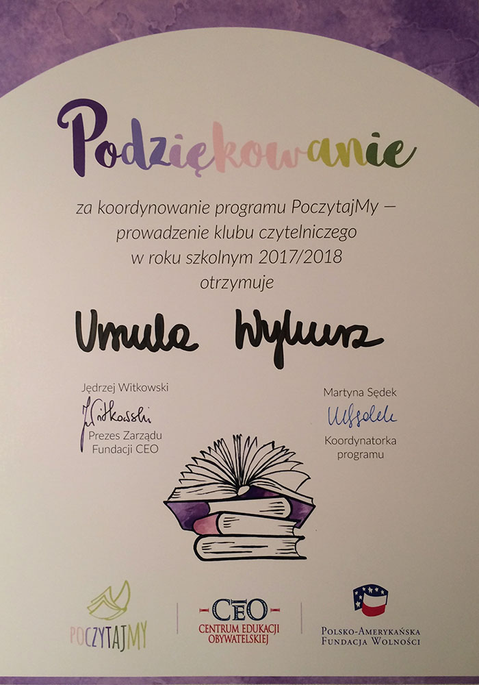 Największym wyróżnieniem i ogromnym zaszczytem była współpraca z Fundacją im. Zbigniewa Herberta w Warszawie. Gimnazjaliści otrzymali list gratulacyjny od pani KATARZYNY HERBERT, małżonki Poety.
