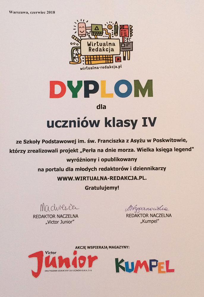 W roku szkolnym 2017/2018 uczniowie klasy IVb zrealizowali na lekcjach j. polskiego projekt edukacyjny „Perła na dnie morza”. Czwartoklasiści redagowali legendy o królowej Bałtyku – Juracie, pisali opowieści o królowej polskich rzek – Wiśle, tworzyli podania o królowej lasów – Boranie, wymyślali magiczne historie o królowej niezapominajek. W projektowym przedsięwzięciu swoich młodszych kolegów wspierały gimnazjalistki z klasy II.