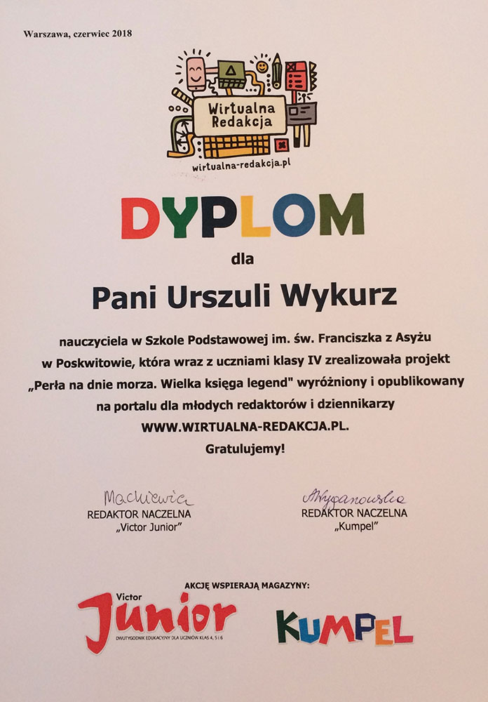 Projekt edukacyjny „Perła na dnie morza” został wysoko oceniony przez Fundację CultureLab z Warszawy oraz redaktor naczelną miesięcznika „Kumpel”, panią Agnieszkę Wyganowską. Uczniowie otrzymali podziękowania i dyplomy, a ich prace umieszczone zostały na platformie czasopisma w dziale Wirtualna Redakcja.