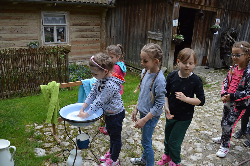 Dnia 26 kwietnia 2018 roku uczniowie klas 0-II wybrali się na wycieczkę do Osady Młynarskiej „Boroniówka” w Grodzisku na warsztaty pod nazwą „Od ziarenka do bochenka”. Po dotarciu na miejsce pierwszym zadaniem uczniów było umycie rąk w specjalnej polowej umywalce, co było dla nich dużym zaskoczeniem. Następnie każdy dostał fartuszek, aby w czasie prac nie pobrudzić sobie ubrań. Zadaniem dzieci było wyrobienie samodzielnie ciasta, rozwałkowanie go, a następnie wykrojenie różnymi foremkami ciasteczek. Po zakończonej pracy i ponownym umyciu rąk, przewodnik zabrał dzieci na spacer po osadzie i wytłumaczył, a także pokazał jak działa młyn wodny, który produkuje mąkę. W tym czasie piekły się ciasteczka, które na koniec dzieci dostały i mogły je zjeść. Zapach pieczonych ciasteczek czuć było wszędzie, a ich smak – niebo w gębie wszystkie dzieci wróciły zadowolone i bogatsze o nową wiedzę.